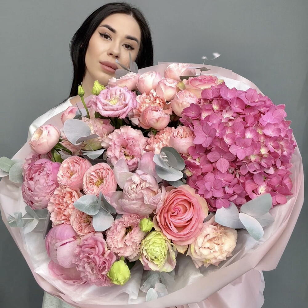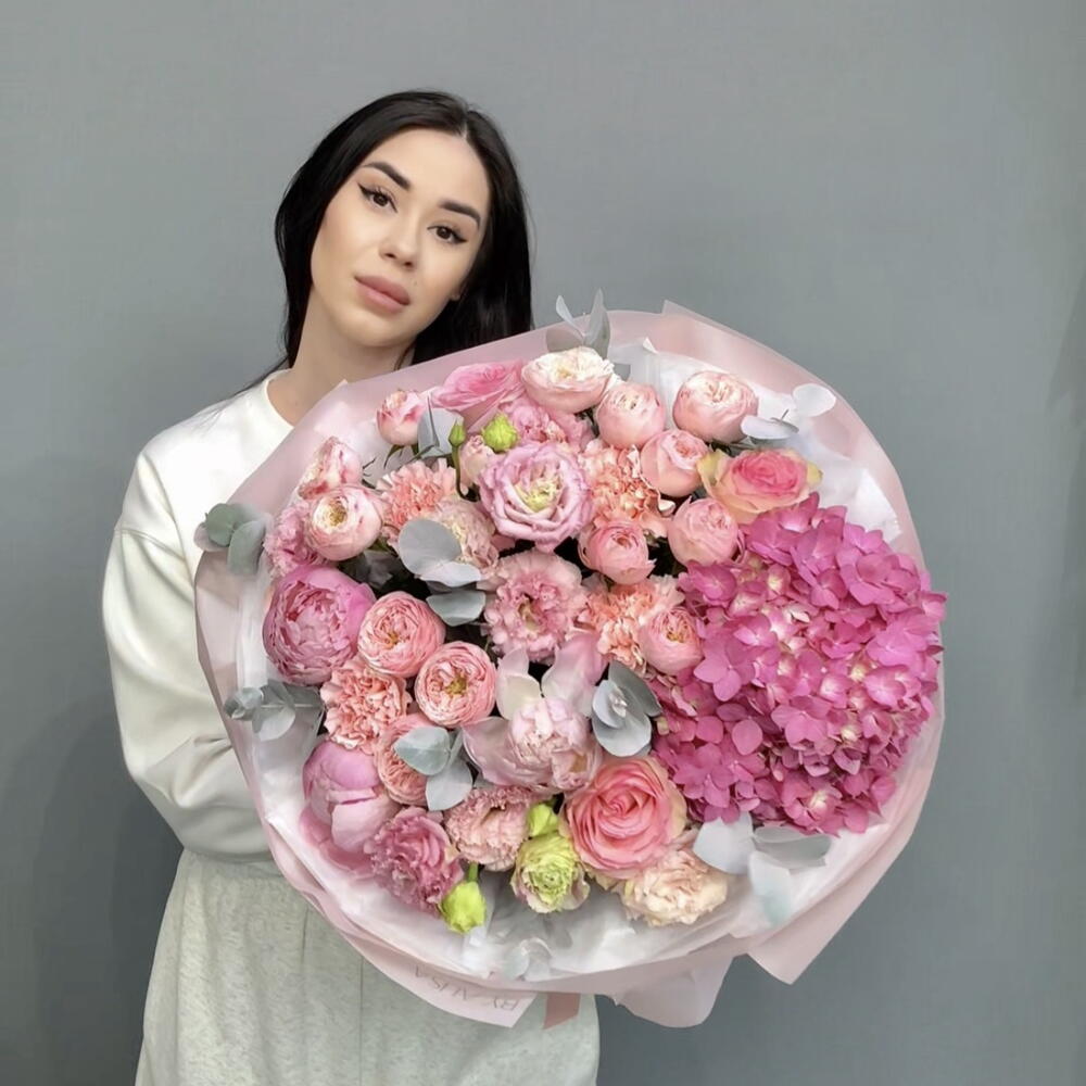 Роза - 3 шт. Эустома - 4 шт. Бомбастик роза - 5 шт. пионы - 3 шт. Гортензия Премиум Микс - 1 шт.