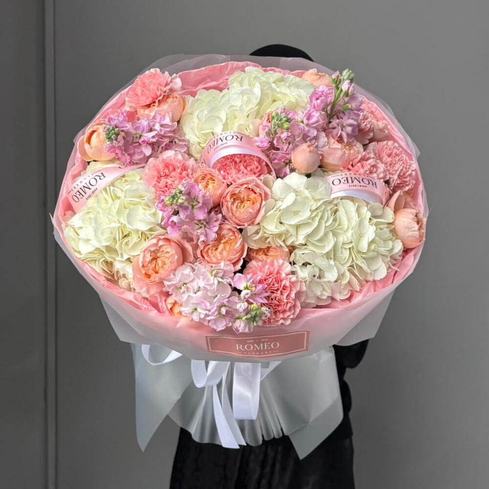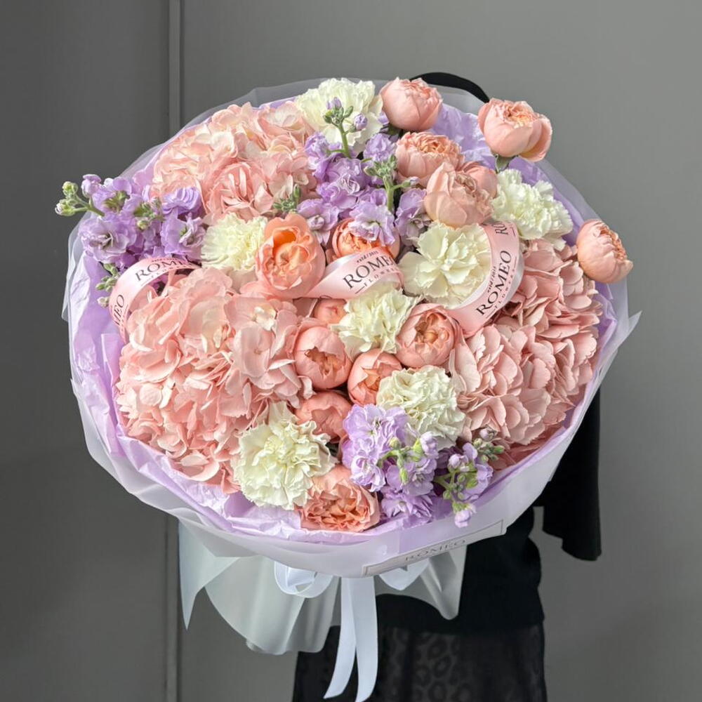 Гортензия - 3 шт. Лента - 1 шт. Маттиола - 5 шт. Гвоздика - 7 шт. Оформление - 1 шт. Спрей роза - 3 шт.