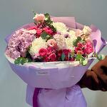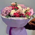 Гортензия - 1 шт. Статица - 2 шт. Эвкалипт - 2 шт. Кустовая роза - 3 шт. Хризантема - 3 шт. Эустома - 3 шт. Лента атласная - 1 шт. Калька упаковка - 4 шт. аквабумага - 5 шт.