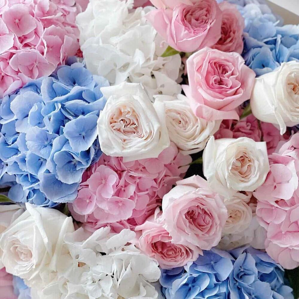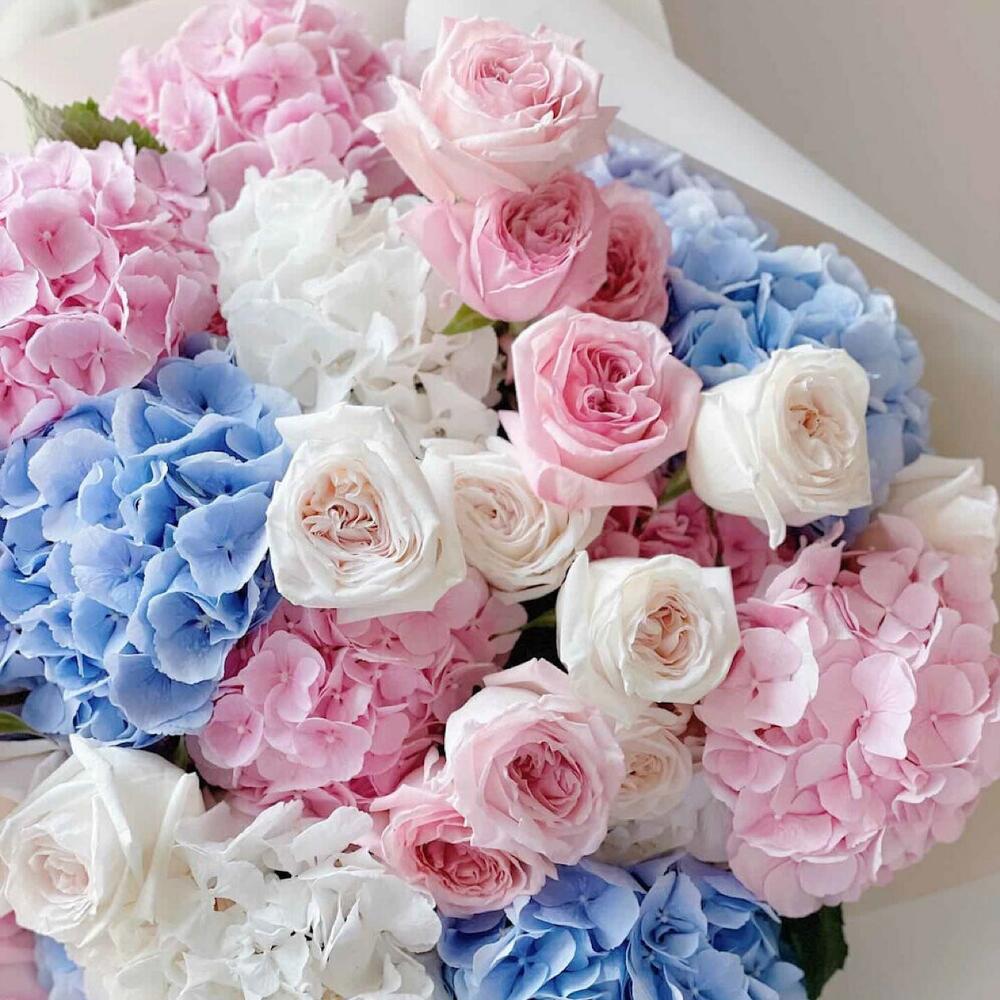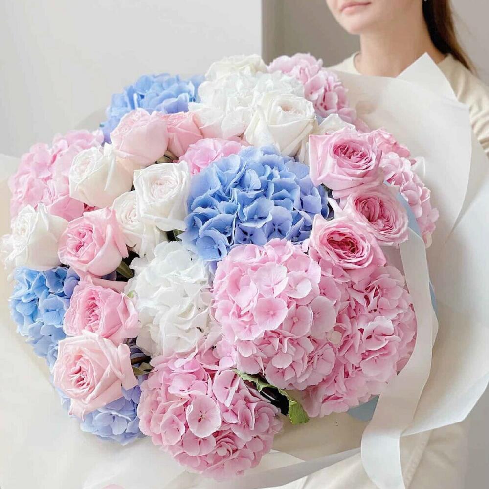 Гортензия - 10 шт. Роза пионовидная - 19 шт. Дизайнерская упаковка - 1 шт.