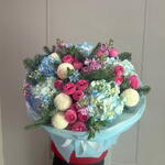 Гортензия голубая - 5 шт. Нобилис - 3 шт. Твидия - 5 шт. кустовая роза жизель - 5 шт. пинг понг хризантема - 5 шт. матиола розовая - 5 шт.