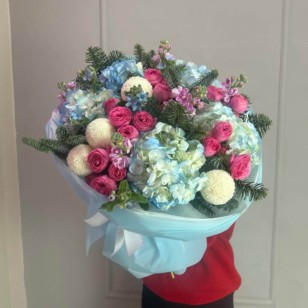 Гортензия голубая - 5 шт. Нобилис - 3 шт. Твидия - 5 шт. кустовая роза жизель - 5 шт. пинг понг хризантема - 5 шт. матиола розовая - 5 шт.