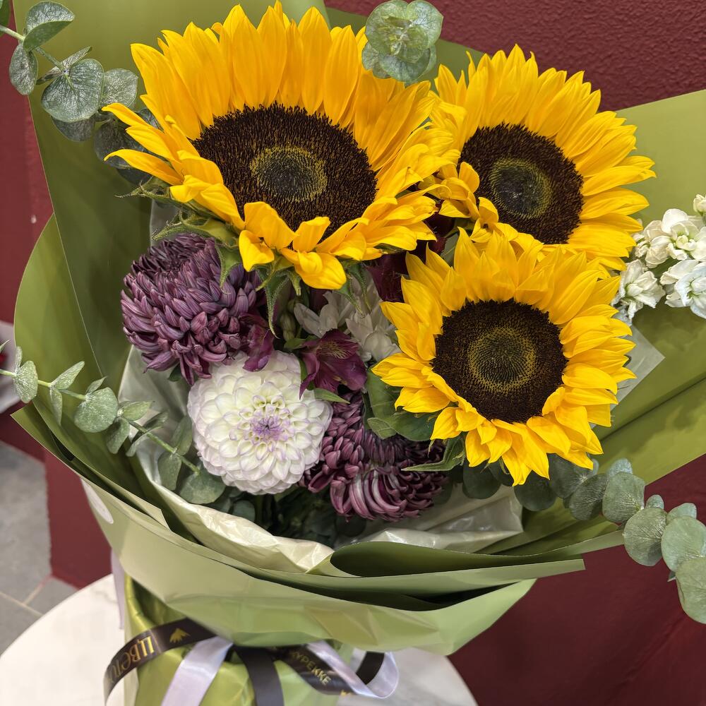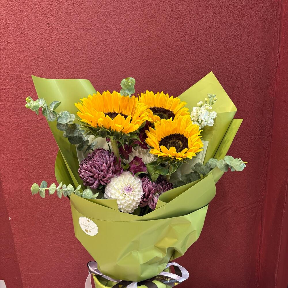 Маттиола - 2 шт. Эвкалипт - 4 шт. Подсолнух - 3 шт. Георгина - 2 шт. Одноголовая хризантема - 2 шт.