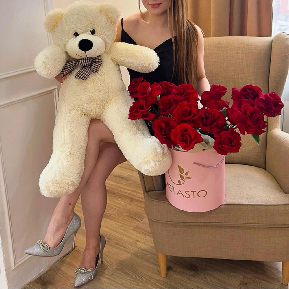 Счастье — это вот такой вот сетик! ❤️🎁 Внутри — всё, что нужно для вау-эффекта: 🌹 Коробка с французскими розами — нежные, ароматные, как признание в любви. Плюшевый мишка и 15 (15!) Шаров сердец. Она точно останется в восторге