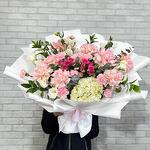 Ваксфлауэр - 3 шт. Гортензия - 1 шт. Рускус - 4 шт. Эвкалипт - 5 шт. Упаковка - 10 шт. Эустома - 4 шт. Лента атласная - 1 шт. Диантус - 8 шт. Французская роза - 9 шт. Спрей роза - 2 шт.