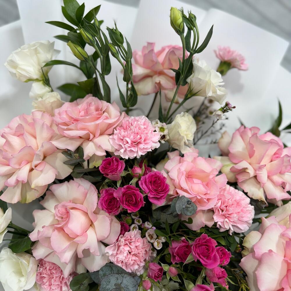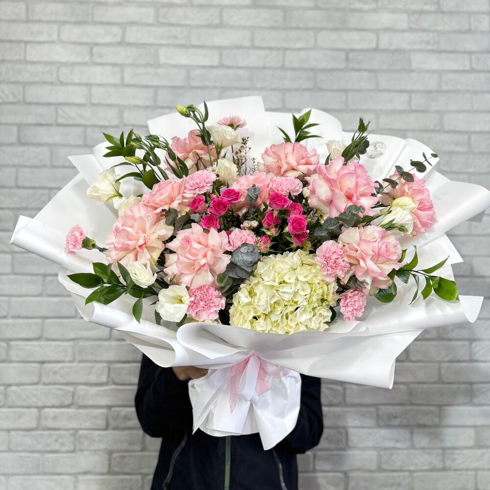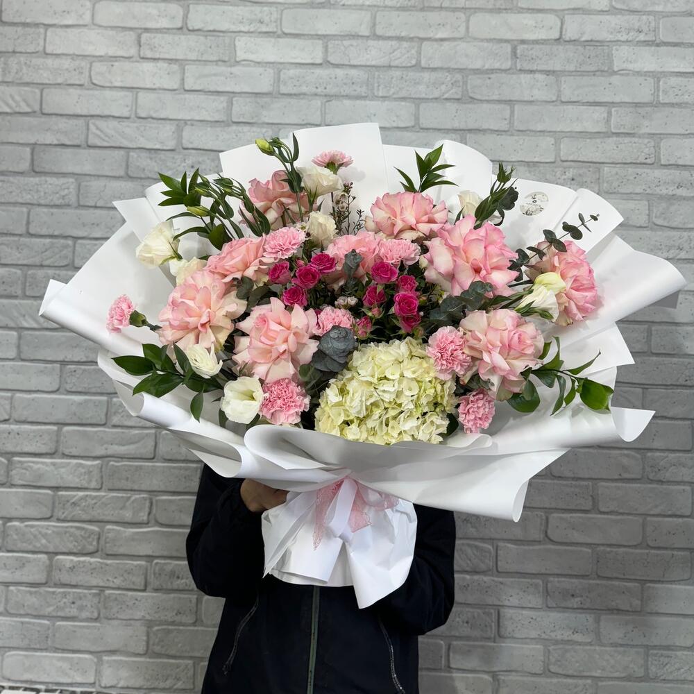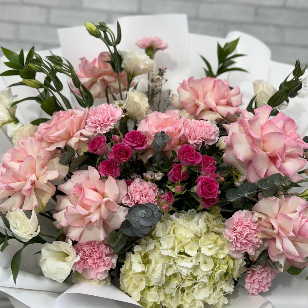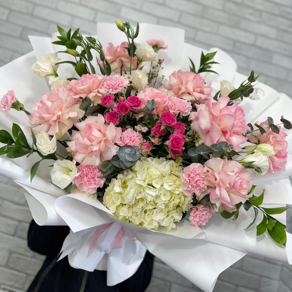 Ваксфлауэр - 3 шт. Гортензия - 1 шт. Рускус - 4 шт. Эвкалипт - 5 шт. Упаковка - 10 шт. Эустома - 4 шт. Лента атласная - 1 шт. Диантус - 8 шт. Французская роза - 9 шт. Спрей роза - 2 шт.
