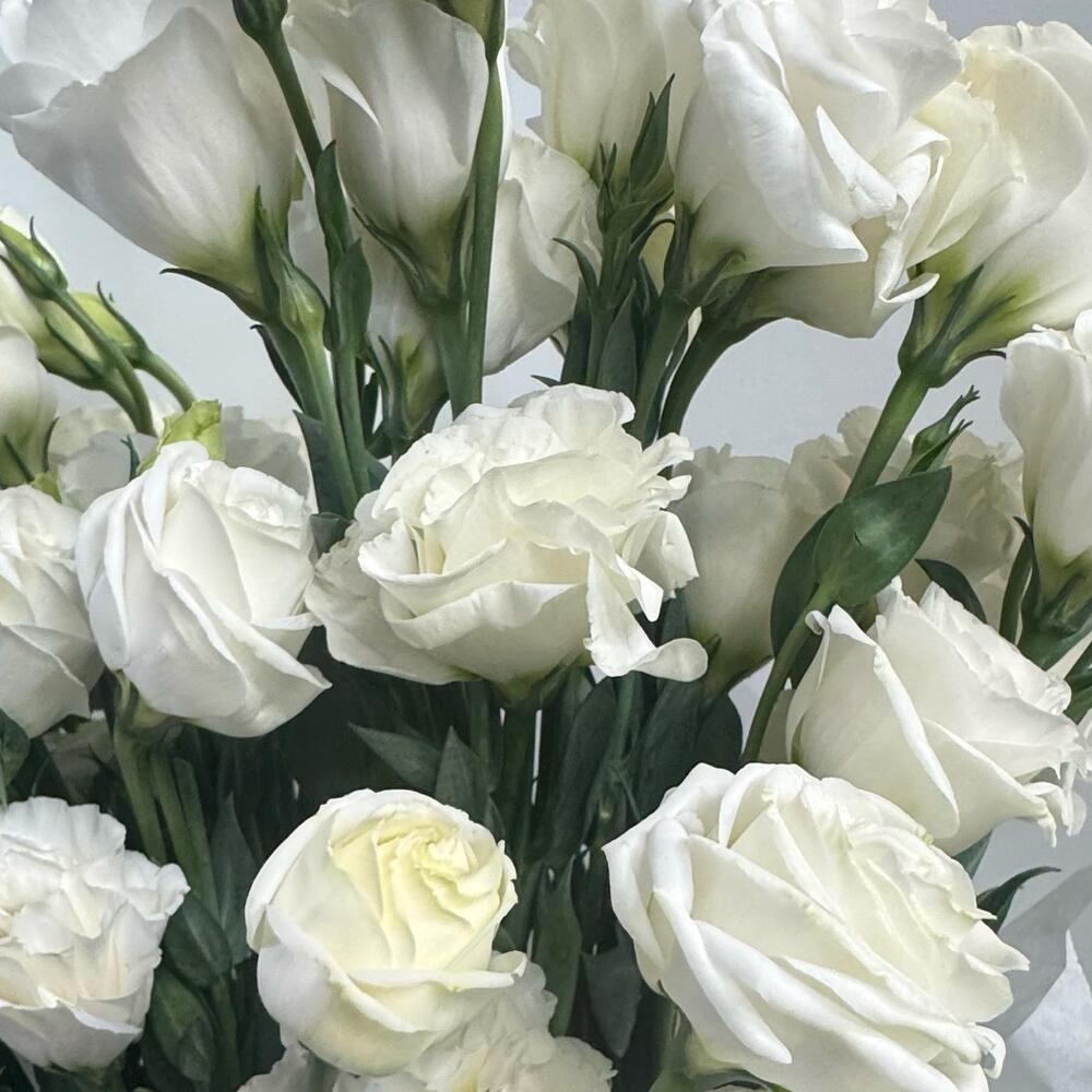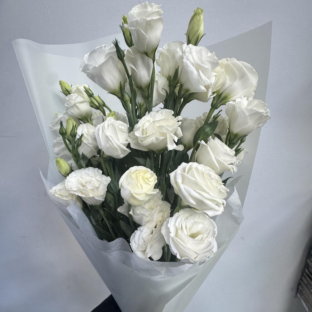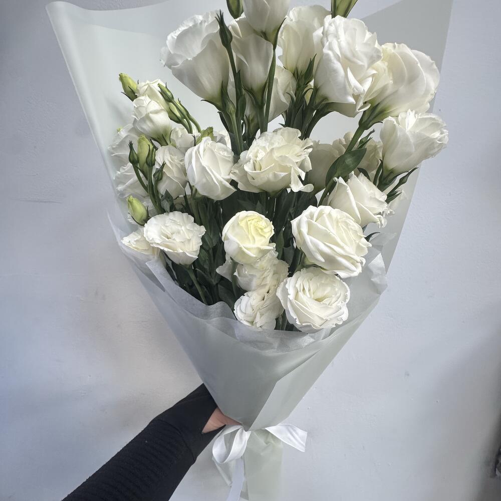 Бант - 1 шт. Пленка матовая - 3 шт. эустома белая - 5 шт.