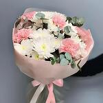 Букет Нежная гармония – это изысканная композиция, где утончённость белых хризантем и элегантность розовых гвоздик переплетаются с ароматными веточками эвкалипта. Аккуратно перевязанный атласной лентой нежных оттенков розового и белого, этот букет олицетворяет чистоту, романтику и воздушность. Идеальный выбор для особого случая или в знак тёплого внимания, он добавит утончённости любому празднику и станет прекрасным подарком для близкого человека.