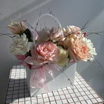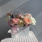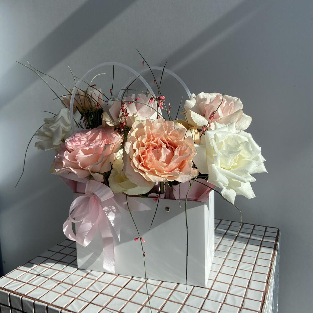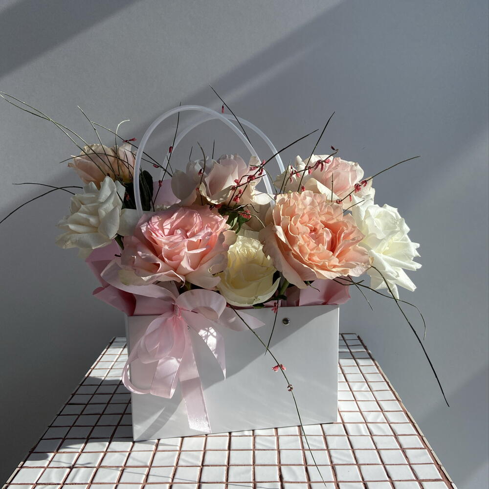Роза - 11 шт. Оазис - 1 шт. Коробка - 1 шт. Гениста - 1 шт. природный материал - 1 шт.