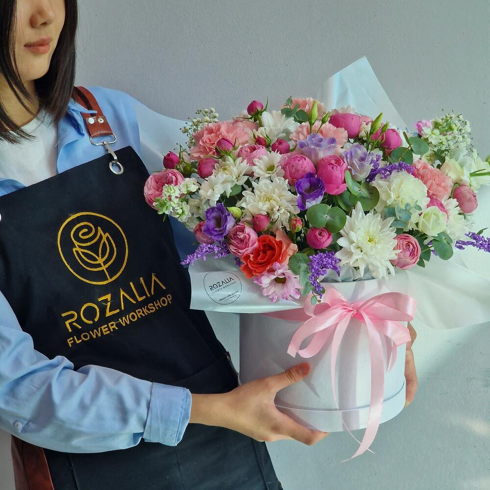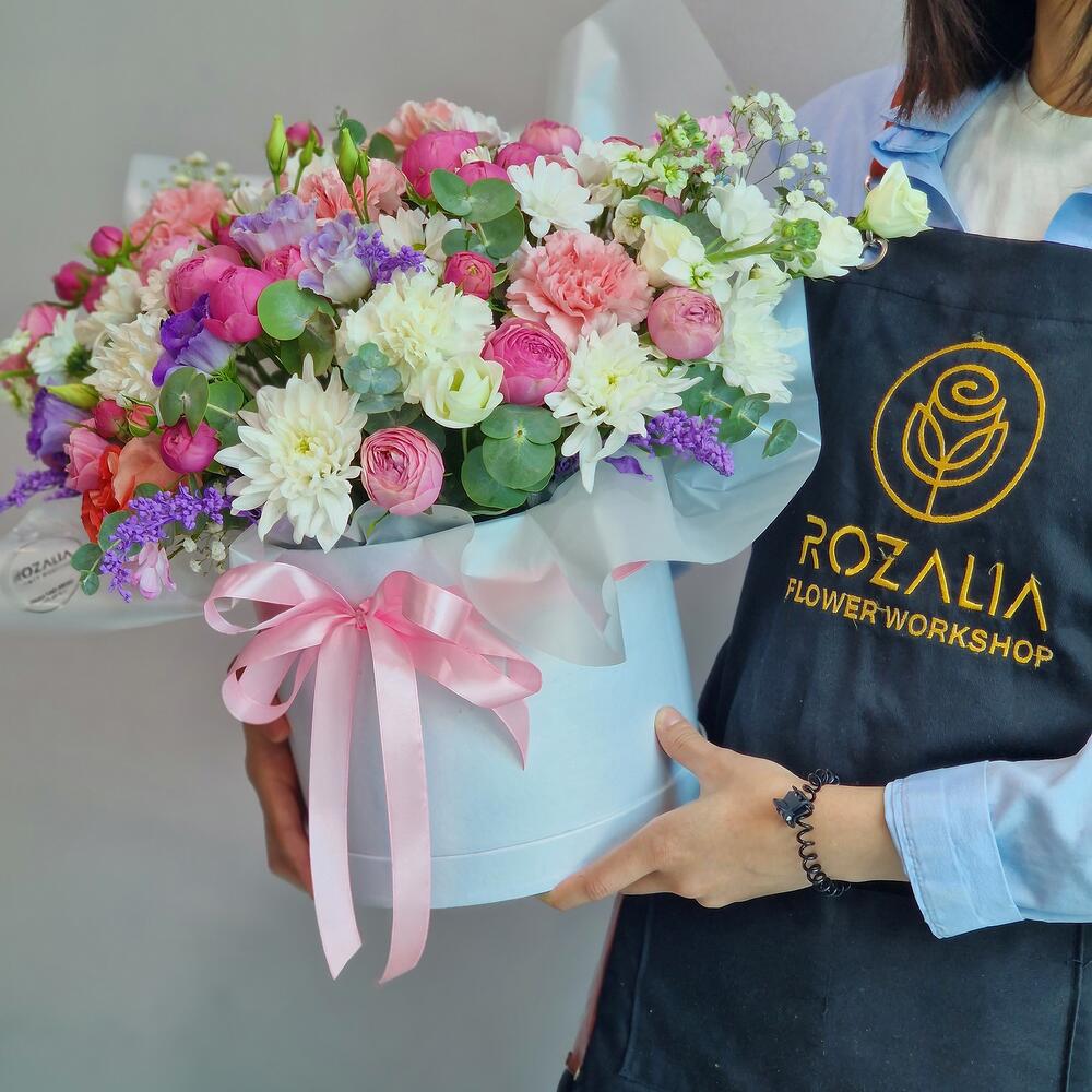 Гипсофила - 1 шт. Маттиола - 2 шт. Хризантема кустовая - 2 шт. Эустома - 5 шт. Диантус - 5 шт. Коробка шляпная - 1 шт. Спрей роза - 3 шт.