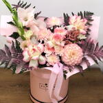 Альстромерия - 1 шт. Хризантема кустовая - 1 шт. Гладиолус - 1 шт. Французская роза - 3 шт. Георгина - 1 шт. ледр - 1 шт.