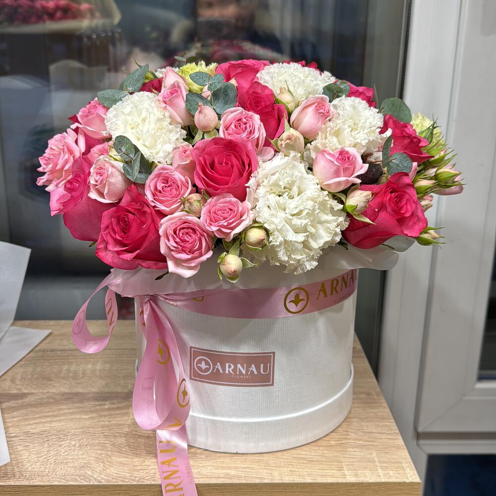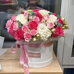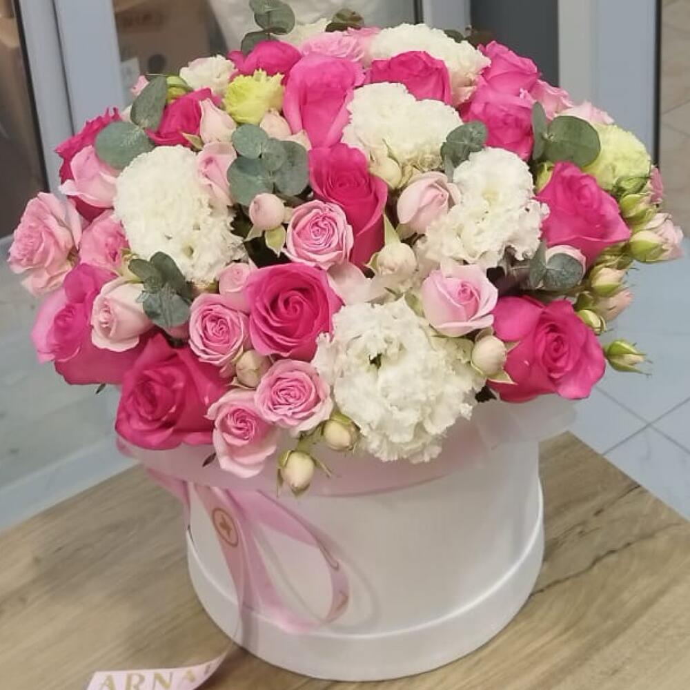 Лизиантус - 10 шт. Эвкалипт - 6 шт. Коробка шляпная - 1 шт. Спрей роза - 6 шт. розы пинкфлойд - 13 шт.