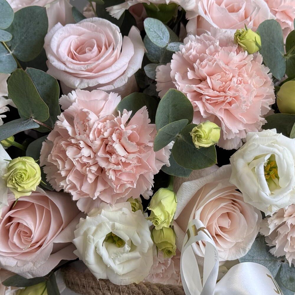 Роза - 5 шт. Эустома - 3 шт. Диантус - 13 шт. Эвкалипт Микс - 11 шт.