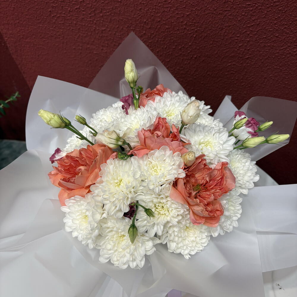 Хризантема кустовая - 2 шт. Эустома - 2 шт. розы драгонфлай - 4 шт.