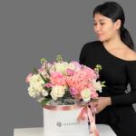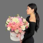 Гортензия - 5 шт. Лизиантус - 4 шт. Маттиола - 3 шт. Пион - 1 шт. Роза - 15 шт. Коробка - 1 шт. джульетта - 4 шт.