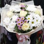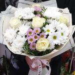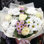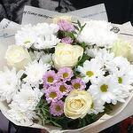 очень нежный воздушный букет в состав которого входят: роза белая Эквадор сорт "прауд" в количестве 5 штук, хризантемы кустовые сорт "бакарди" 2 штуки, сорт "Балтика белая" 2 штуки, и очень милые розовые хризантемы, зелень эвкалипта, в упаковке Крафт. такой букет подойдет по любому поводу, а так же для для любого возраста получателя.