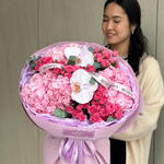 Гортензия - 3 шт. Эвкалипт - 1 шт. Лента атласная - 1 шт. орхидея - 2 шт. Оформление - 1 шт. Спрей роза - 4 шт.
