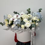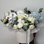 Гиперикум - 2 шт. Хризантема кустовая - 2 шт. Эвкалипт - 3 шт. Роза - 2 шт. Эустома - 3 шт. Коробка шляпная - 1 шт. Гортензия голубая - 4 шт. Фаленопсис - 3 шт.