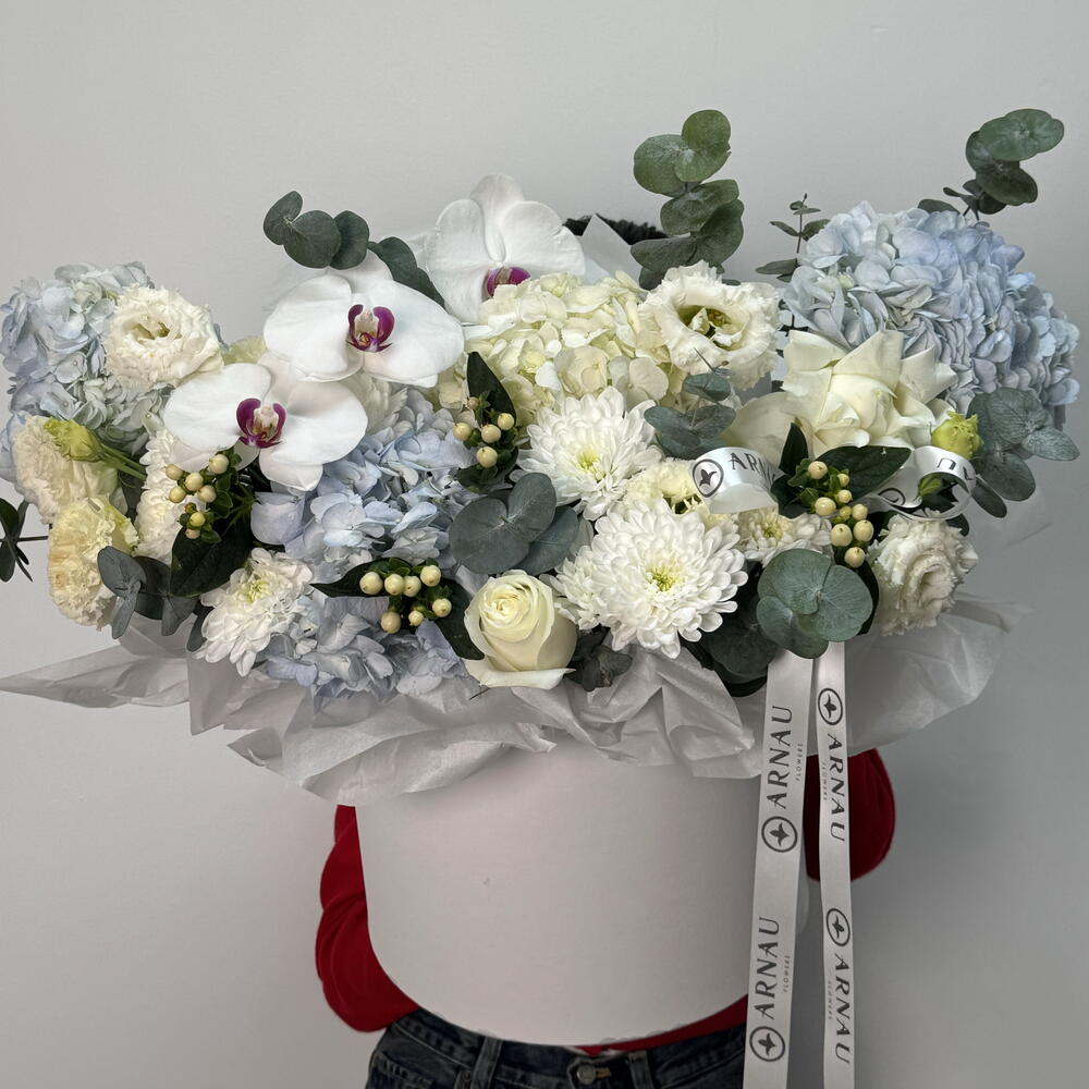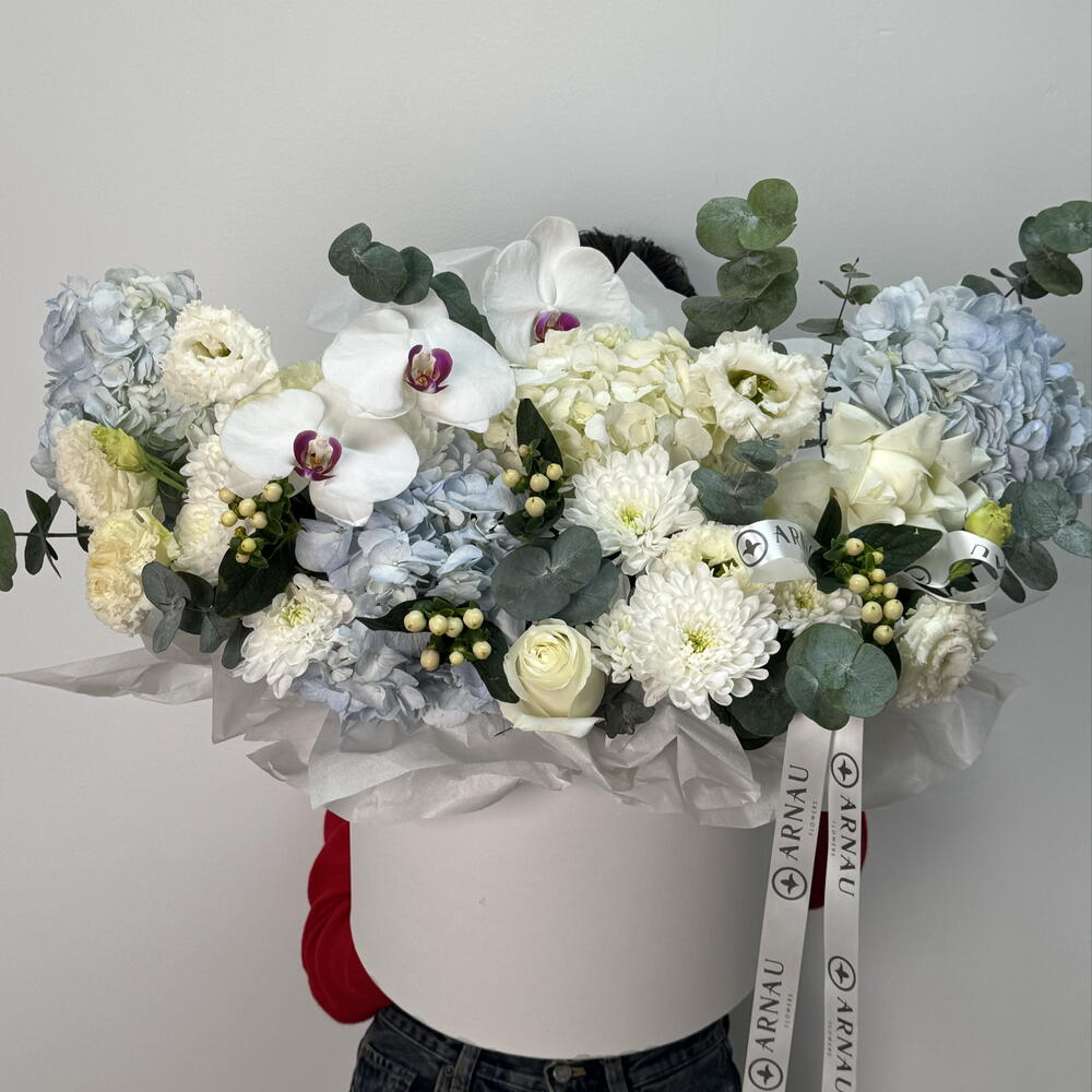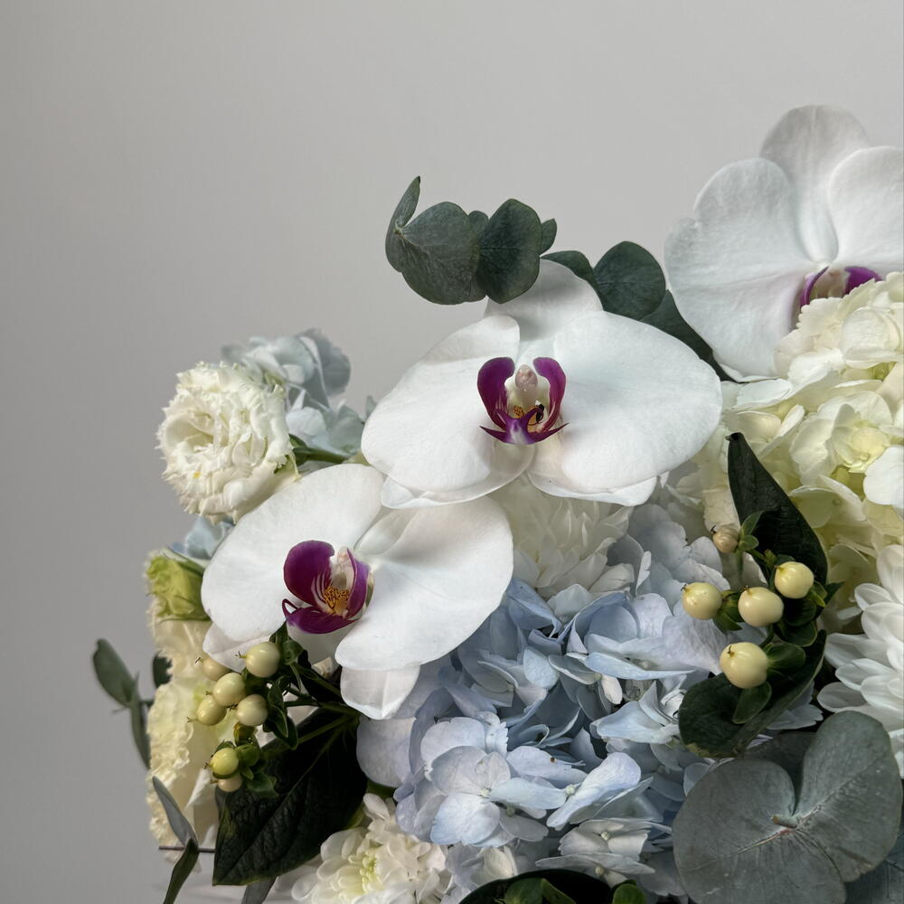 Гиперикум - 2 шт. Хризантема кустовая - 2 шт. Эвкалипт - 3 шт. Роза - 2 шт. Эустома - 3 шт. Коробка шляпная - 1 шт. Гортензия голубая - 4 шт. Фаленопсис - 3 шт.