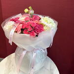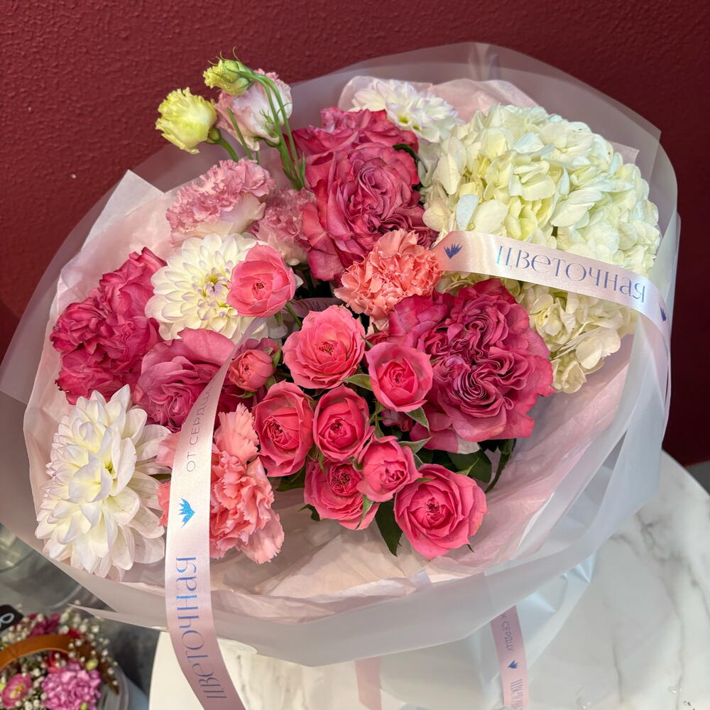 Гортензия - 2 шт. Роза - 3 шт. Кустовая роза - 2 шт. Эустома - 2 шт. Георгина - 3 шт. гвоздики - 5 шт.