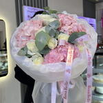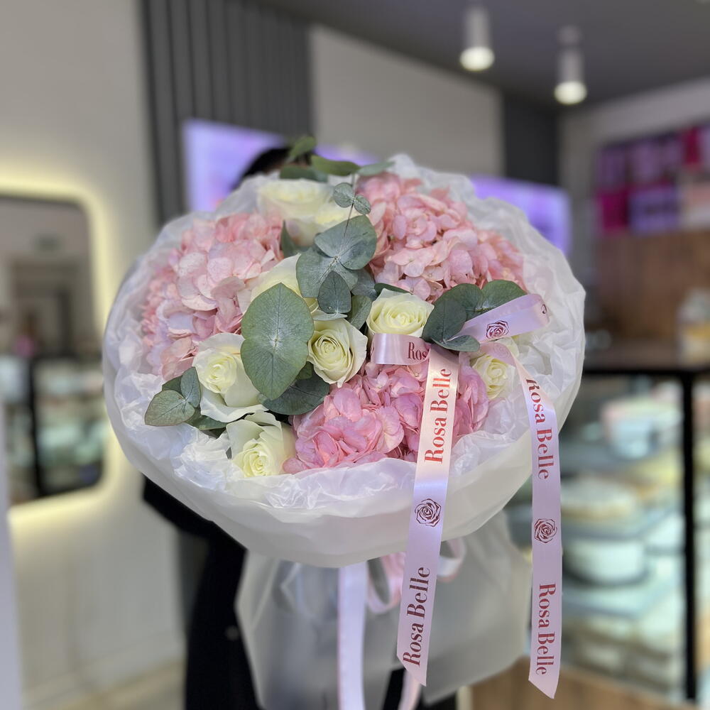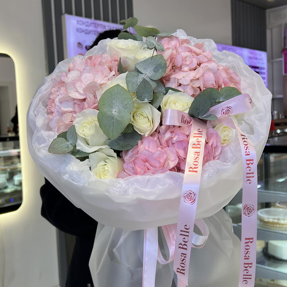Шикарный букет из премиум гортензий и белоснежных роз с эвкалиптом, матовое оформление очень сочетается в данном букете, создает стиль и минимализм которые ценят многие дамы 🥰