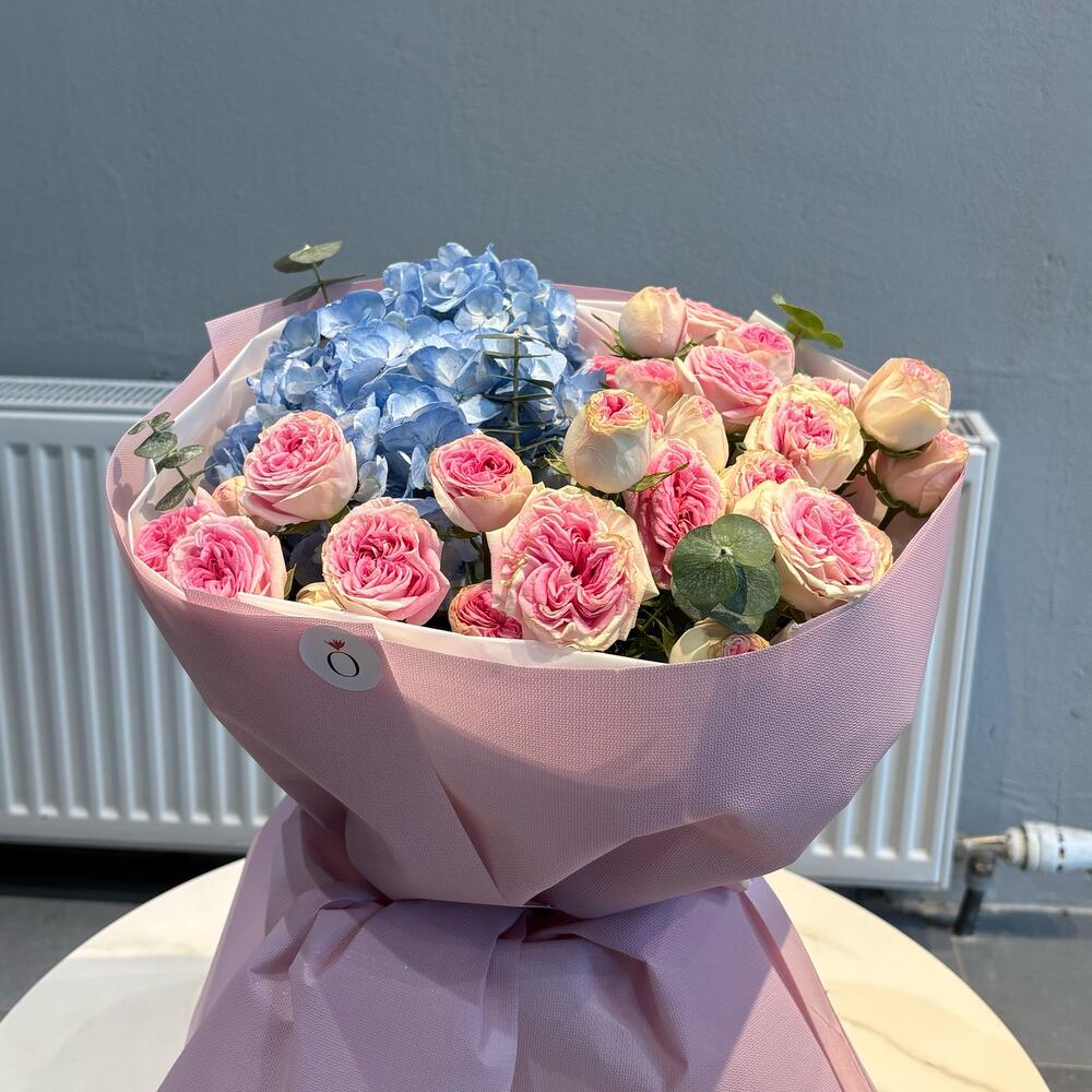 Гортензия - 1 шт. Роза кустовая - 8 шт. Эвкалипт - 4 шт.