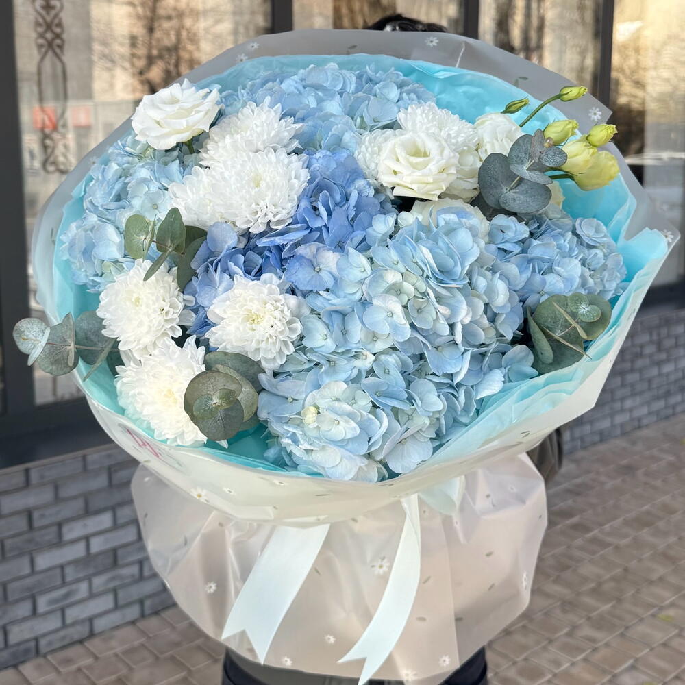 Гортензия - 5 шт. Лизиантус - 2 шт. Хризантема кустовая - 3 шт. Эвкалипт - 1 шт. Оформление - 1 шт.