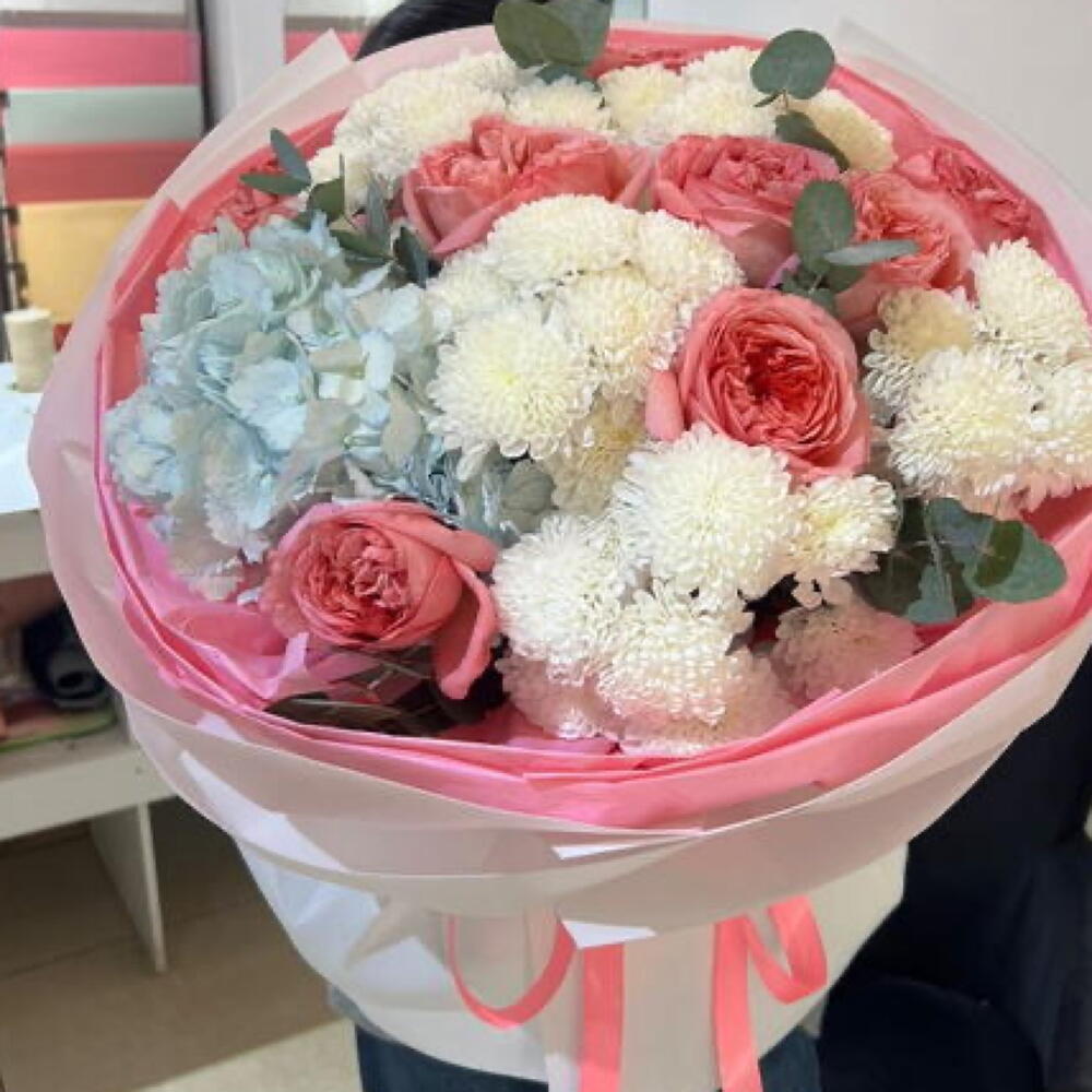 Гортензия - 1 шт. Хризантема кустовая - 5 шт. Эвкалипт - 2 шт. Роза Голландская - 7 шт.