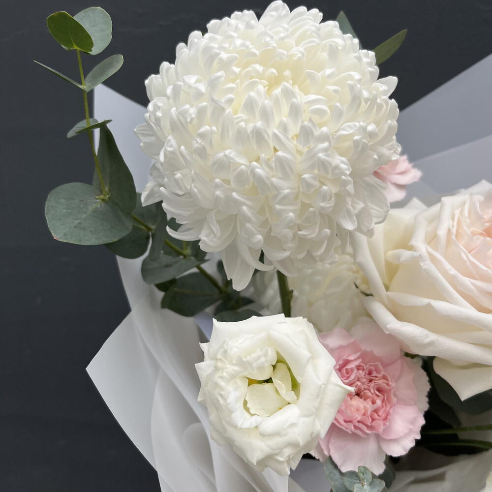 Эвкалипт - 2 шт. Аквабокс - 1 шт. эустома белая - 1 шт. коробка транспортировочная - 1 шт. диантус брют - 3 шт. хризантема бигуди белая - 2 шт. роза white o"hara - 1 шт.