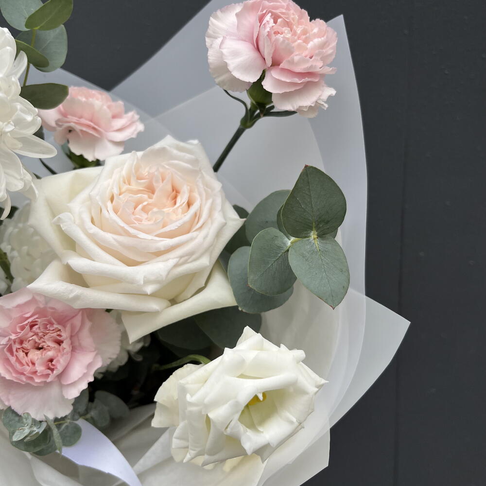 Нежный букет с розой, имеющей невероятный аромат. Имеет мягкую, элегантную цветовую палитру. Стильный, романтичный и утонченный букет, идеально подходящий для выражения благодарности, симпатии или в качестве подарка на любое событие
