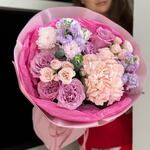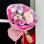 Гортензия - 1 шт. Маттиола - 2 шт. Роза кустовая - 2 шт. Хризантема кустовая - 1 шт. Эвкалипт - 2 шт. Роза - 5 шт.