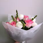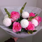 Нежный и гармоничный букет в белой матовой упаковке 🤍 В составе: розовые розы с аккуратной каймой, белые хризантемы-помпоны с изящными бутонами. Контраст ярких роз и воздушных белых шаров создаёт эффект свежести, а фрезия добавляет лёгкость. Композиция выглядит аккуратно, современно и очень женственно