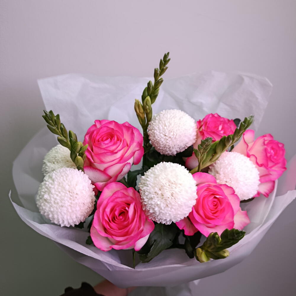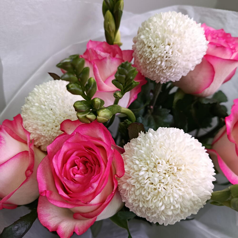 Нежный и гармоничный букет в белой матовой упаковке 🤍 В составе: розовые розы с аккуратной каймой, белые хризантемы-помпоны с изящными бутонами. Контраст ярких роз и воздушных белых шаров создаёт эффект свежести, а фрезия добавляет лёгкость. Композиция выглядит аккуратно, современно и очень женственно