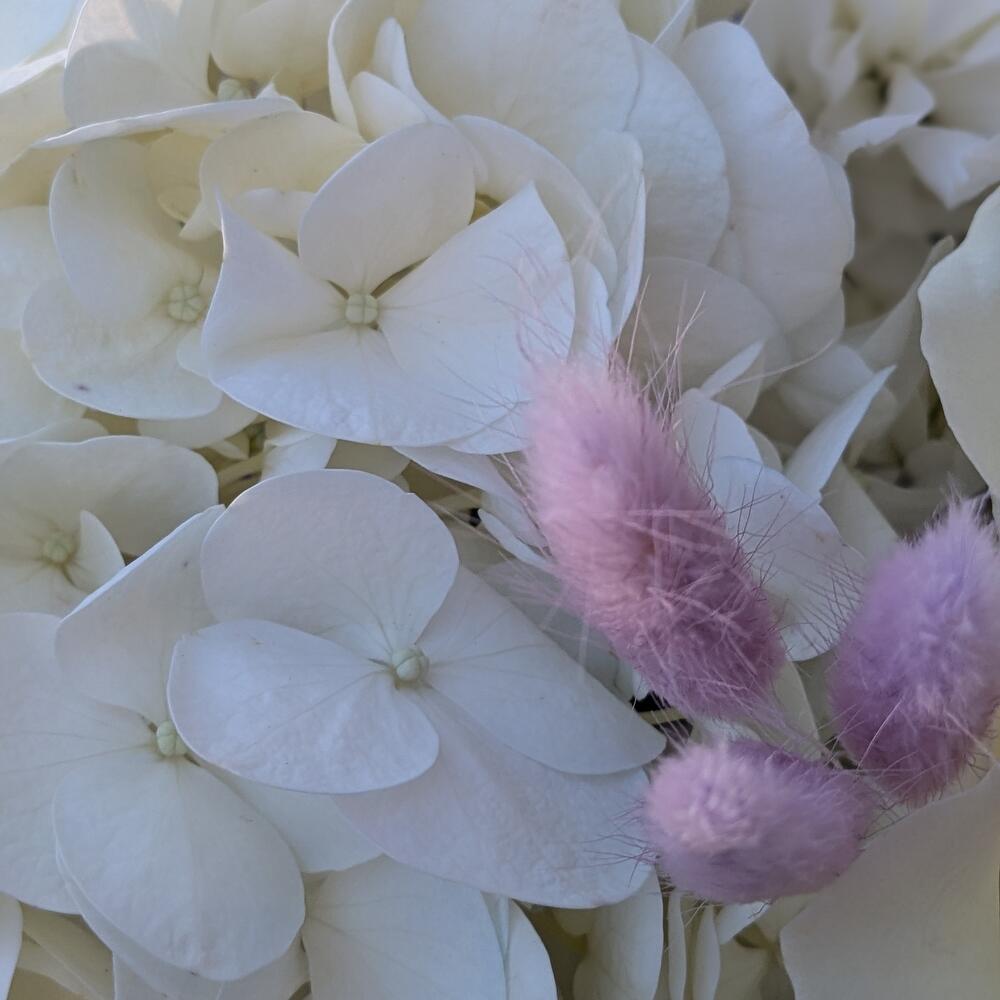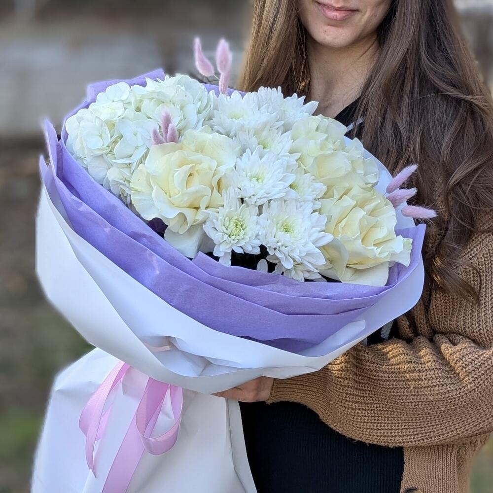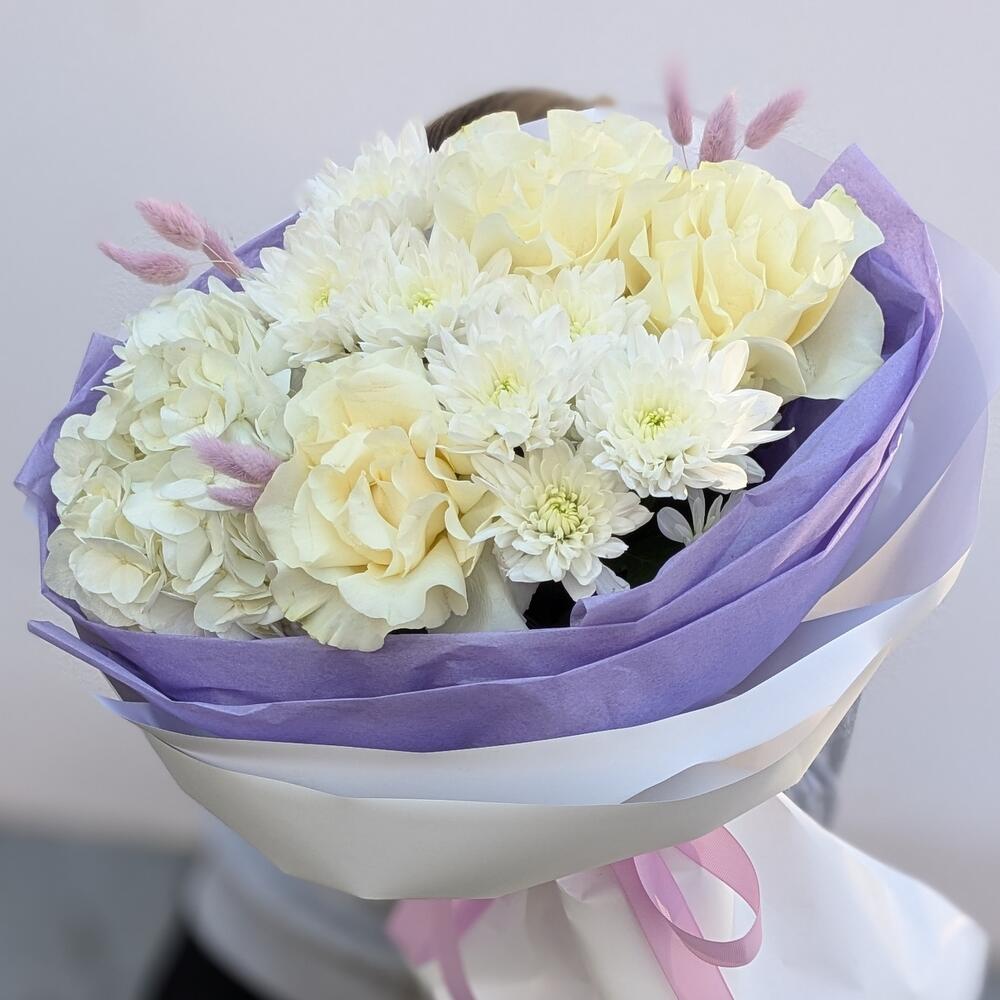 Гортензия - 1 шт. Хризантема кустовая - 2 шт. Роза - 3 шт. Лагурус - 9 шт.