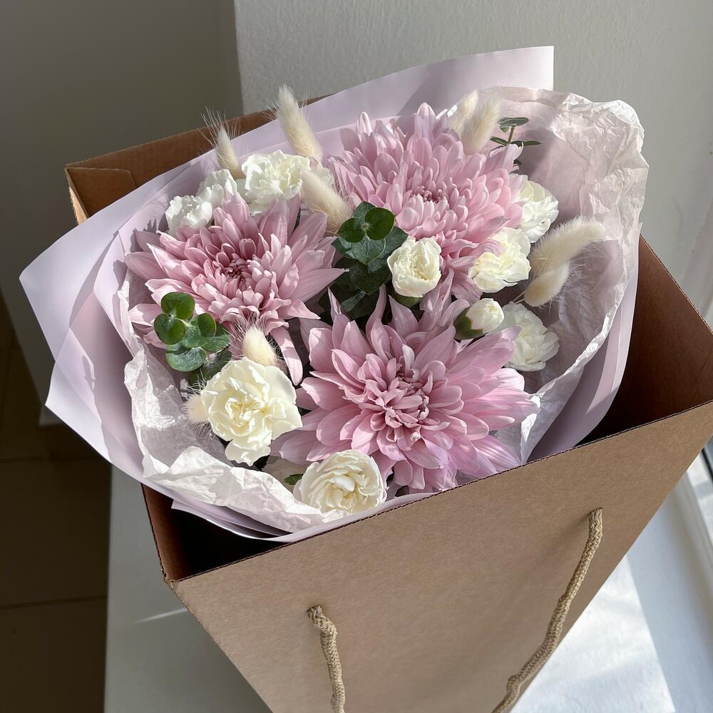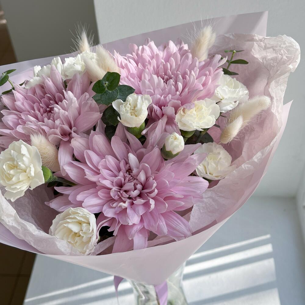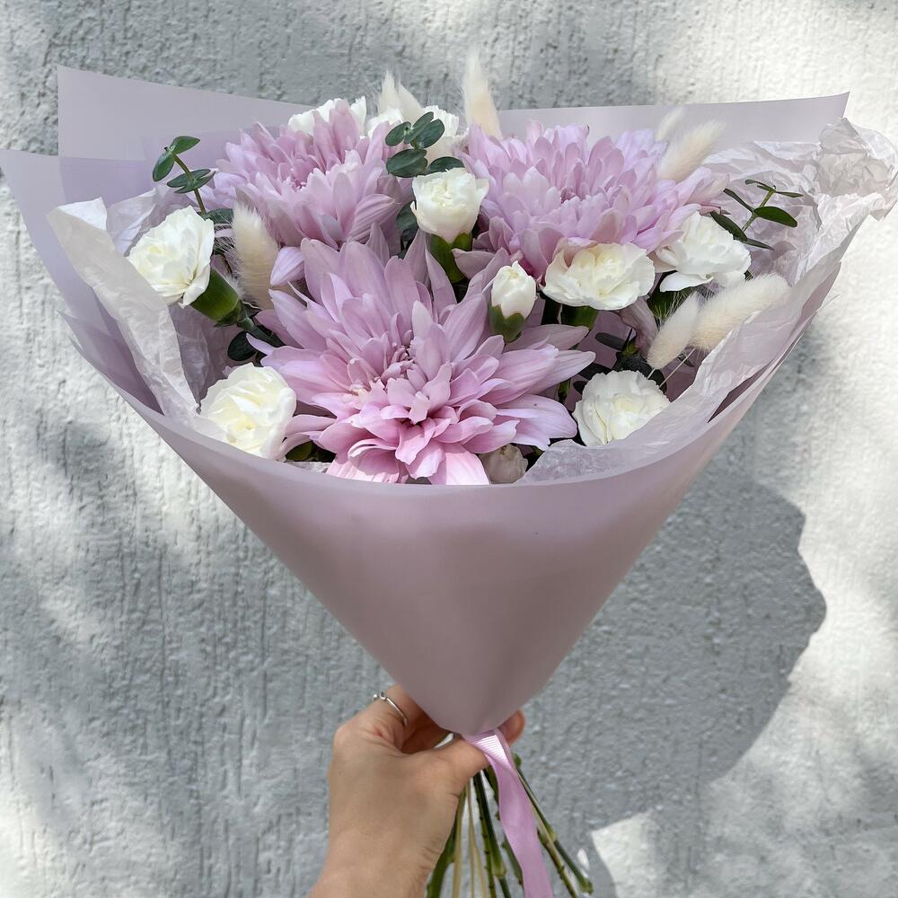 Эвкалипт - 1 шт. Хризантема одноголовая - 3 шт. Диантус кустовой - 4 шт. Лагурус - 9 шт.