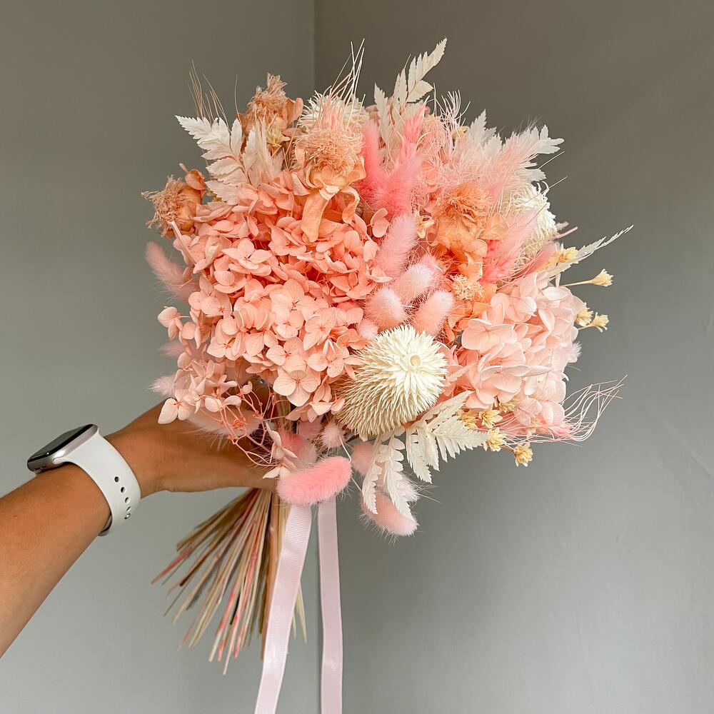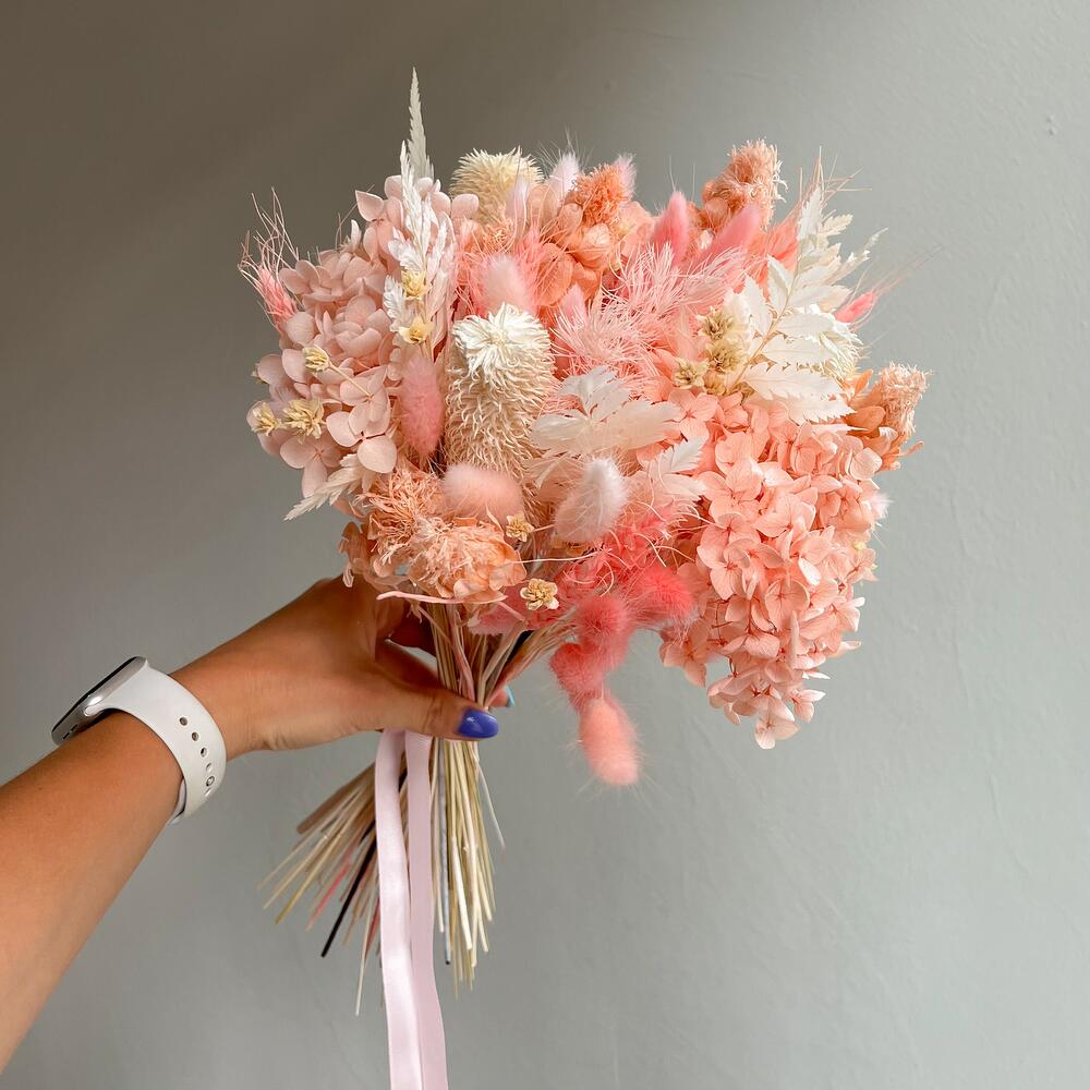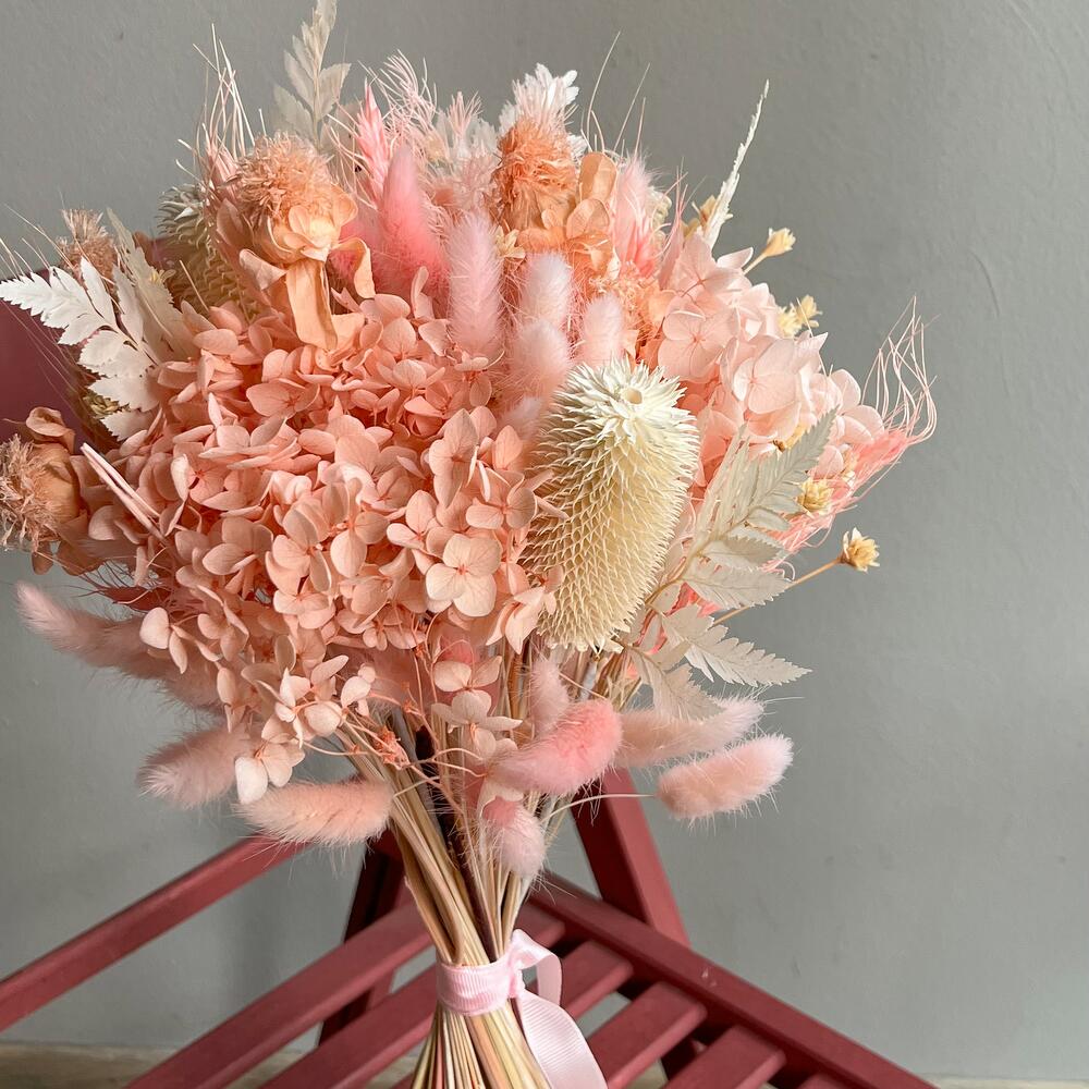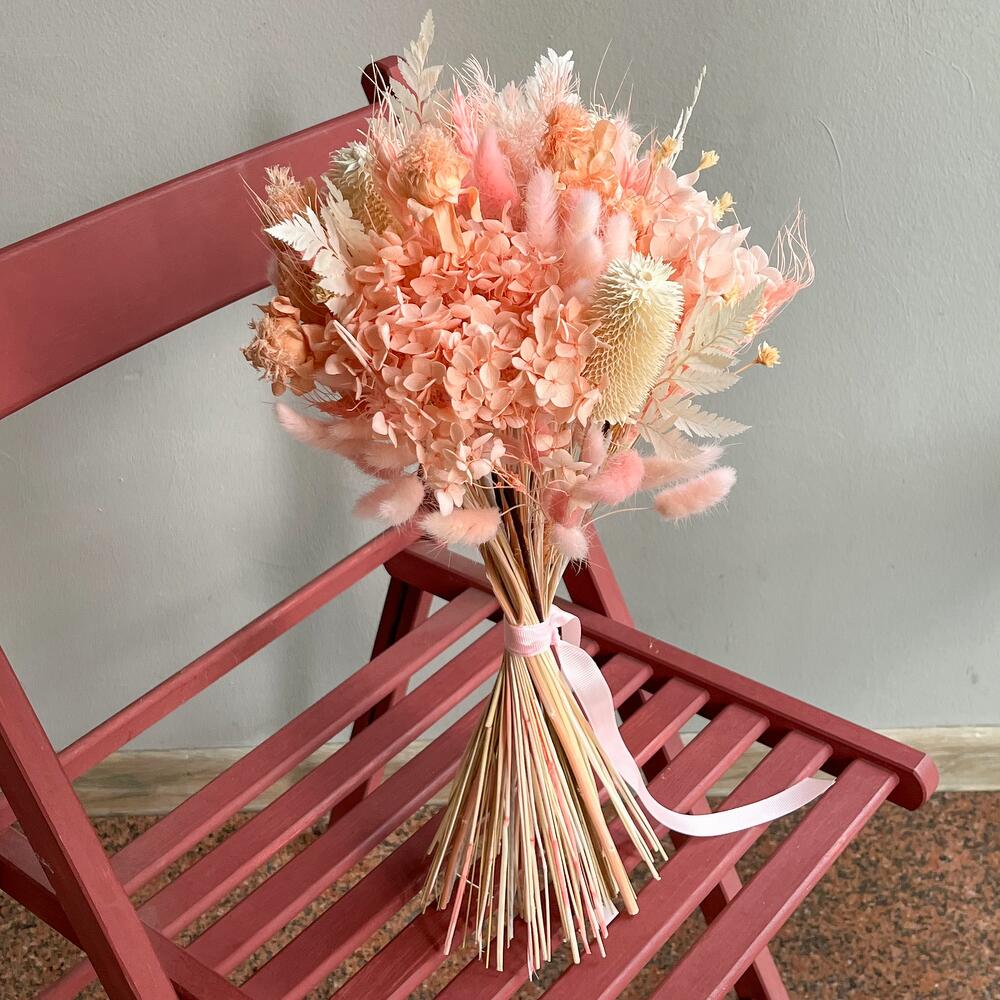 Гортензия - 3 шт. Папоротник - 5 шт. Аспарагус - 1 шт. Пшеница - 15 шт. Лагурус - 54 шт. кардус - 3 шт. сафлор - 10 шт. хиллфлаур - 1 шт.