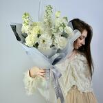 Белоснежный дуобукет из душистой маттиолы и махровой эустомы в дизайнерской упаковке