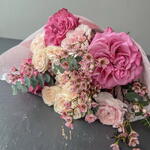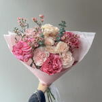Роза кустовая - 2 шт. Диантус - 3 шт. роза кантри - 3 шт. шамелациум - 1 шт. эвкалипт бейби - 3 шт.