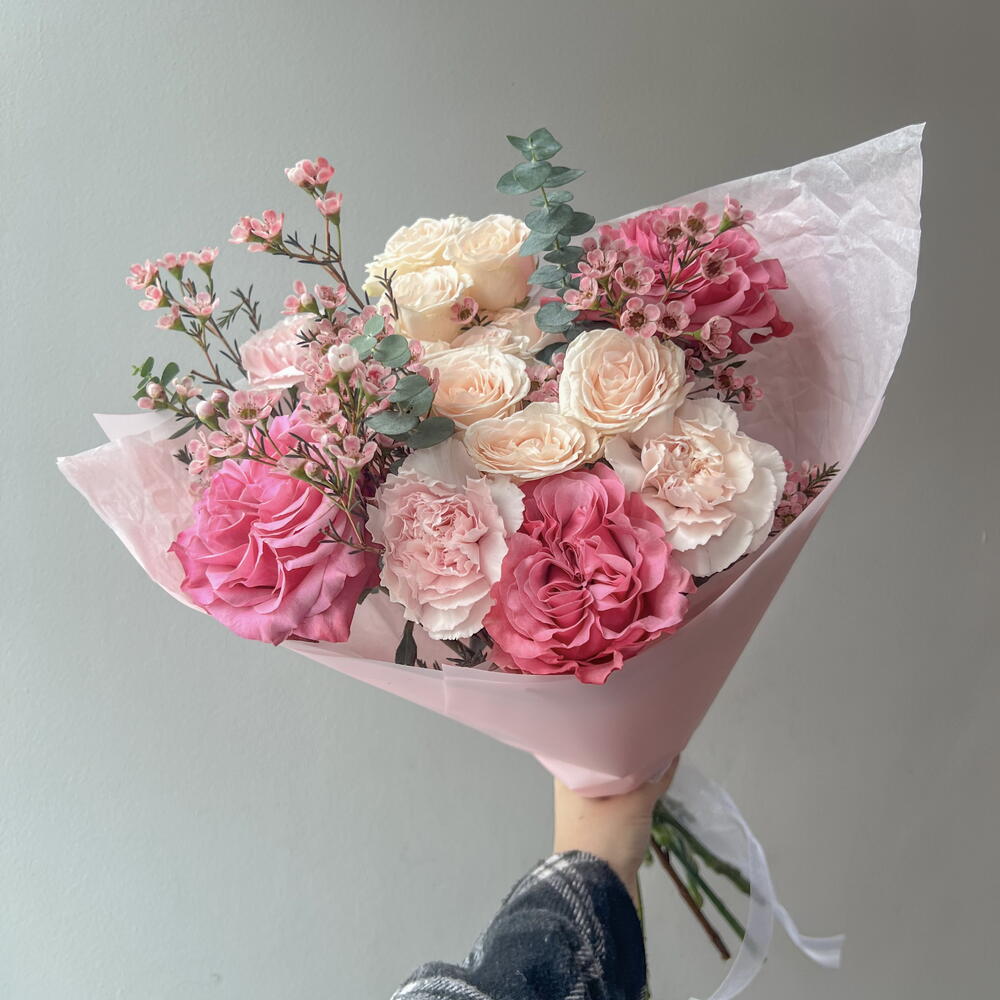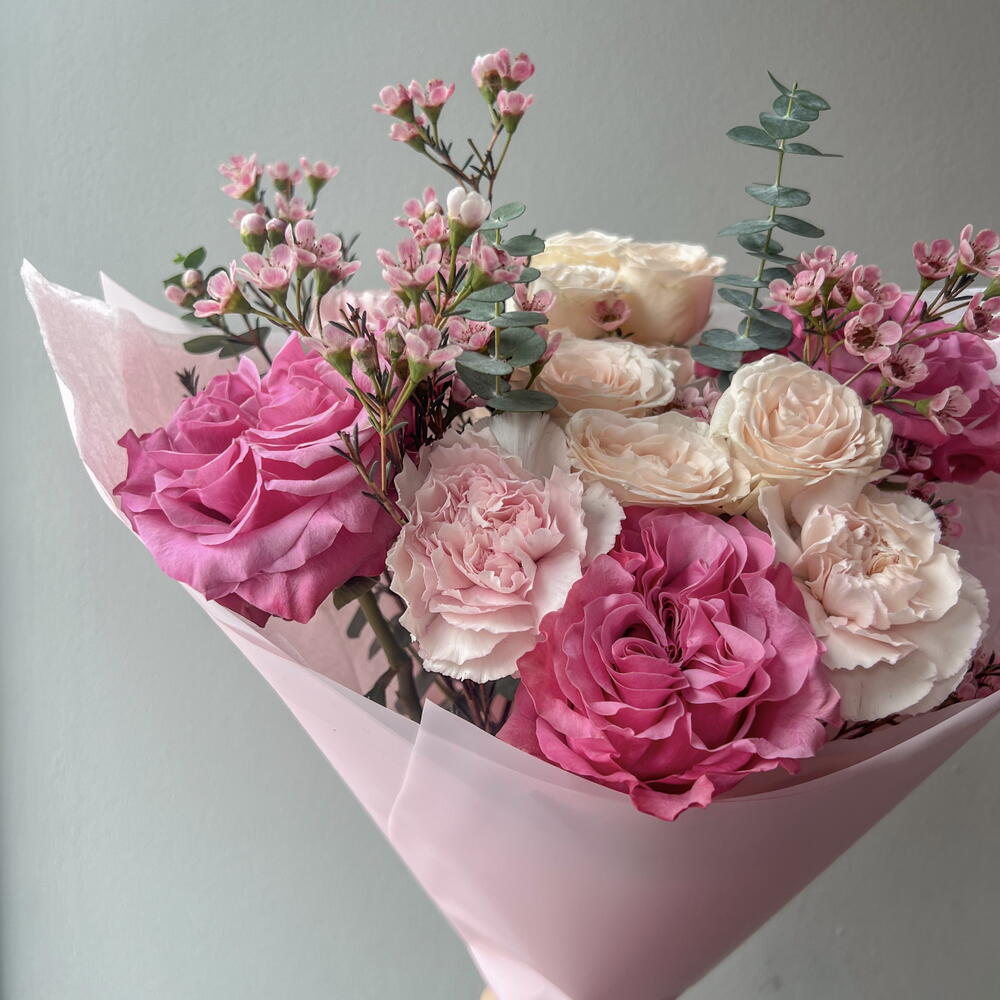 Роза кустовая - 2 шт. Диантус - 3 шт. роза кантри - 3 шт. шамелациум - 1 шт. эвкалипт бейби - 3 шт.