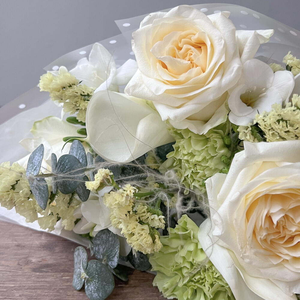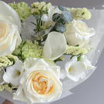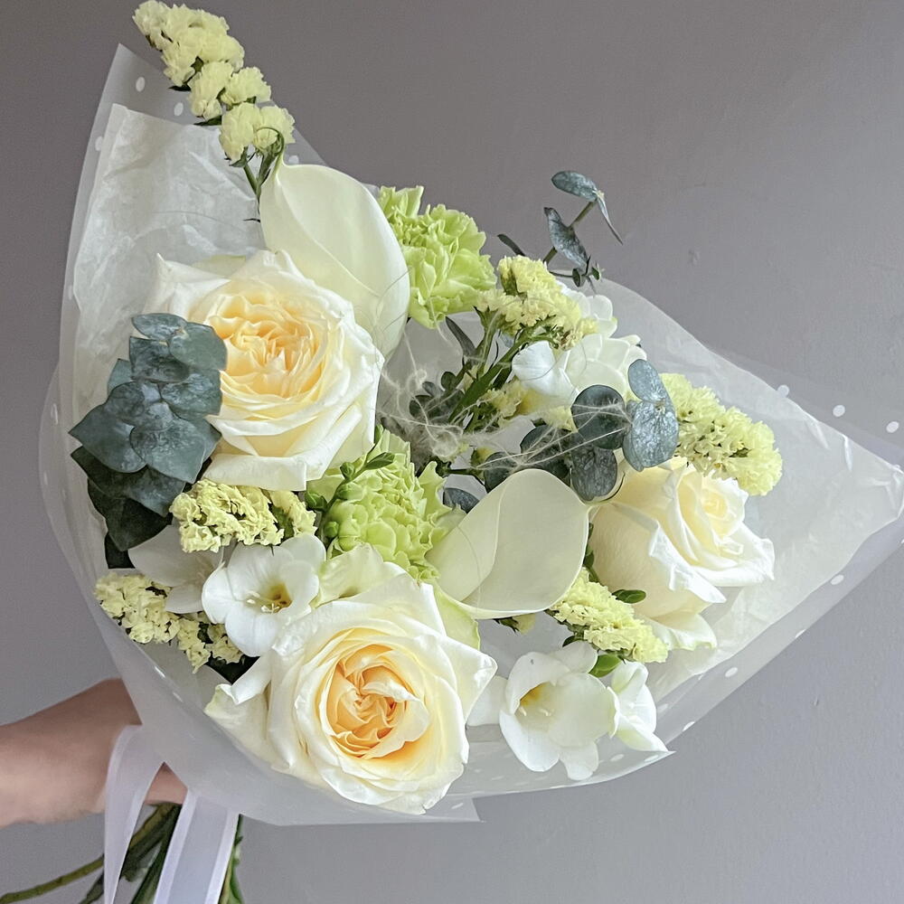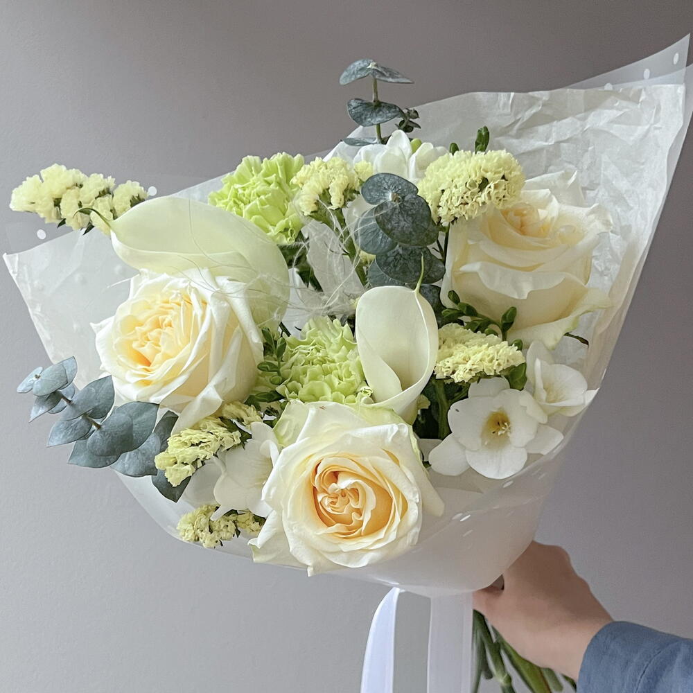 Калла - 2 шт. Статица - 1 шт. Фрезия - 3 шт. Диантус - 2 шт. роза кендллайт - 3 шт. эвкалипт бейби - 1 шт.