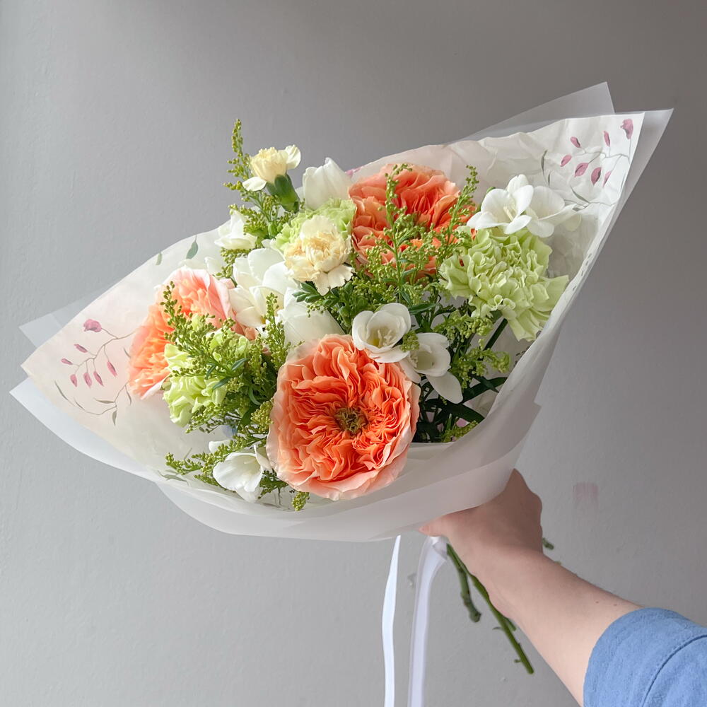 Солидаго - 3 шт. Тюльпан - 3 шт. Фрезия - 5 шт. Диантус - 3 шт. Диантус кустовой - 2 шт. роза мелон экспрешн - 3 шт.