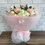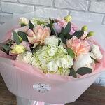 Гортензия - 2 шт. Лента - 1 шт. Лизиантус - 3 шт. Эвкалипт - 3 шт. Диантус - 3 шт. Французская роза - 3 шт. Калька упаковка - 3 шт. бумага дизайнерская - 4 шт.