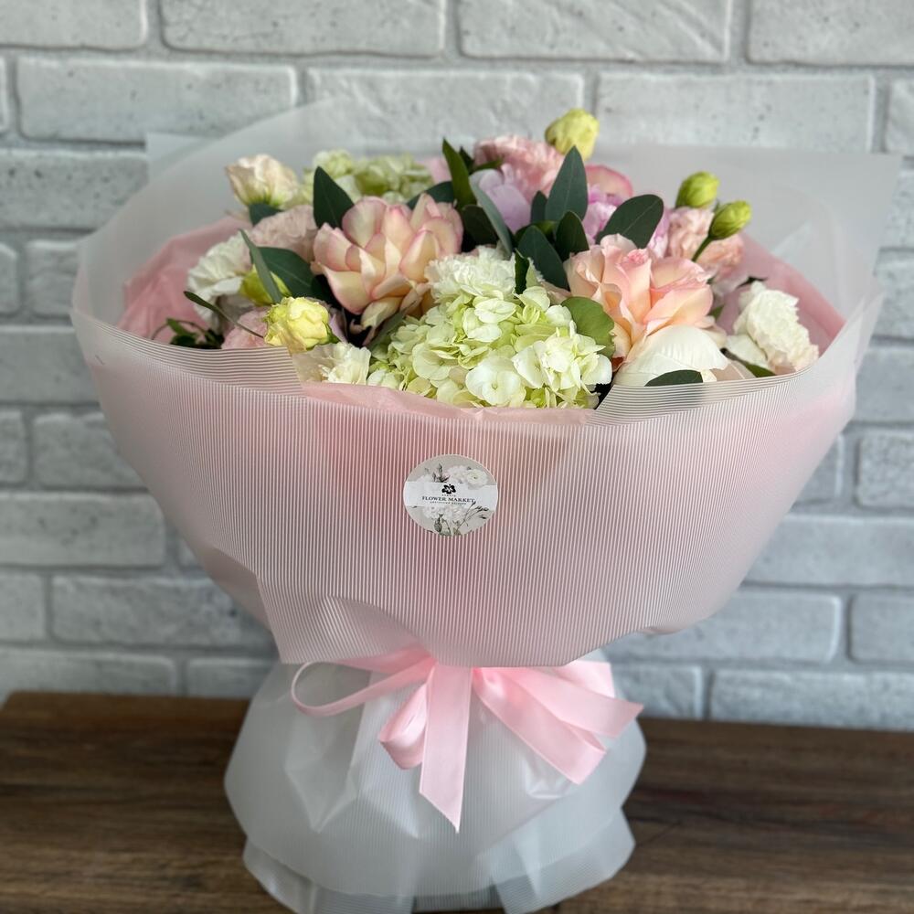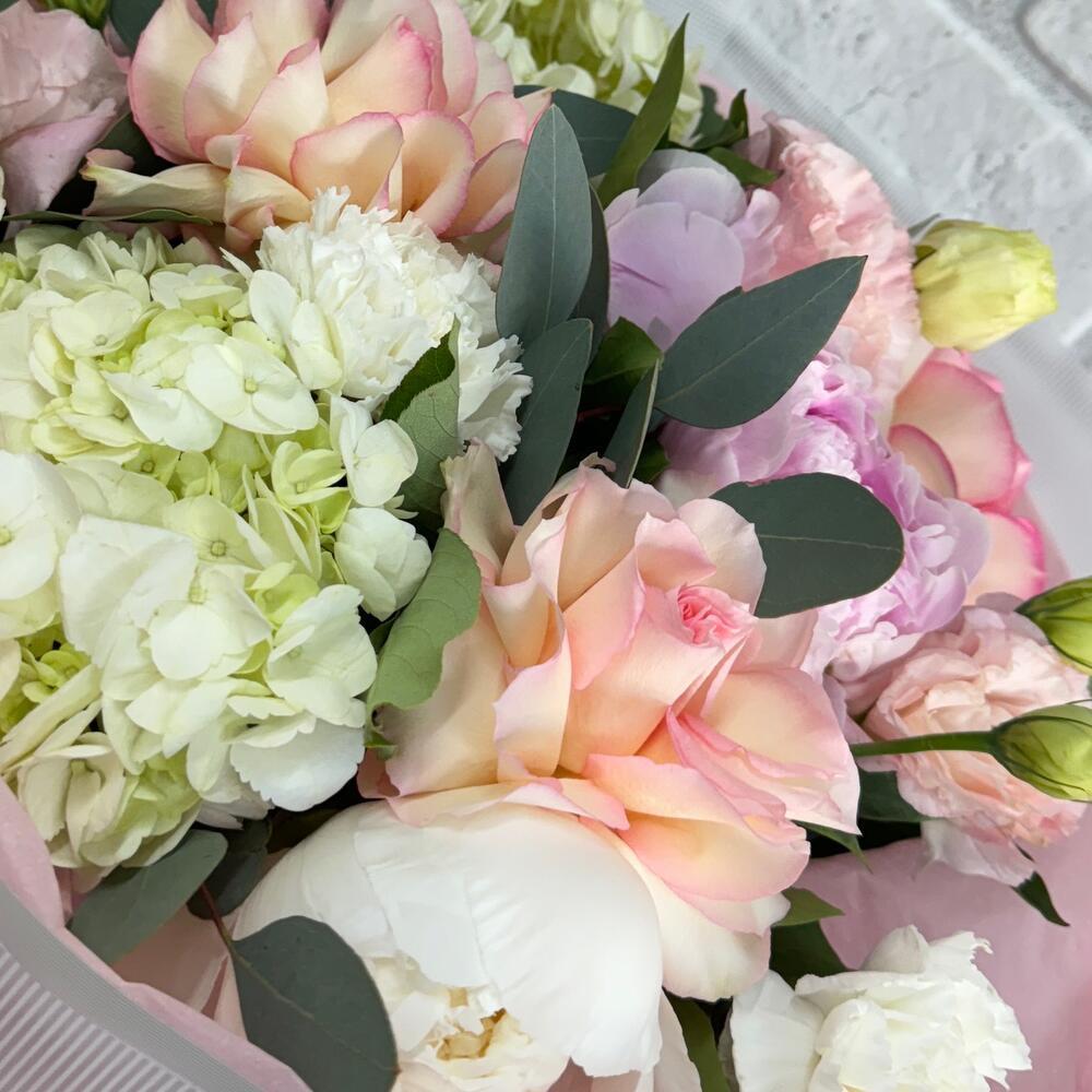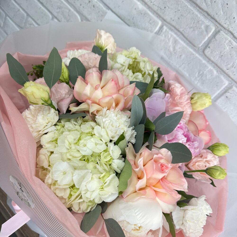 Гортензия - 2 шт. Лента - 1 шт. Лизиантус - 3 шт. Эвкалипт - 3 шт. Диантус - 3 шт. Французская роза - 3 шт. Калька упаковка - 3 шт. бумага дизайнерская - 4 шт.