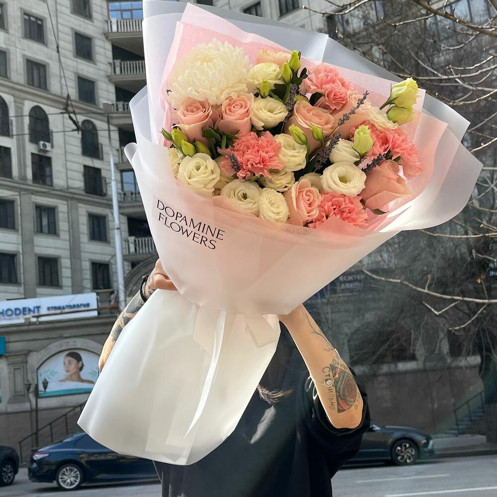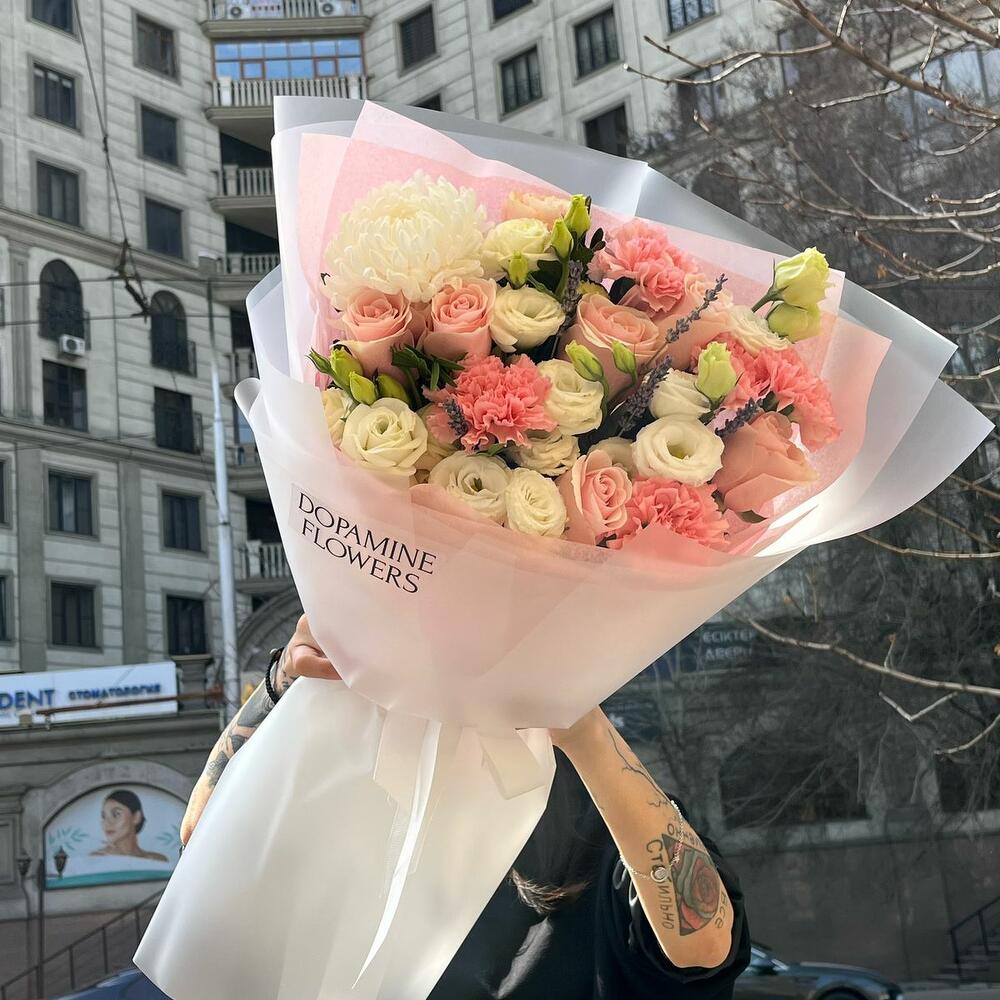 Роза - 6 шт. Гвоздика - 5 шт. Эустома - 3 шт. Хризантема одноголовая - 1 шт. Лаванда сухоцвет - 5 шт.