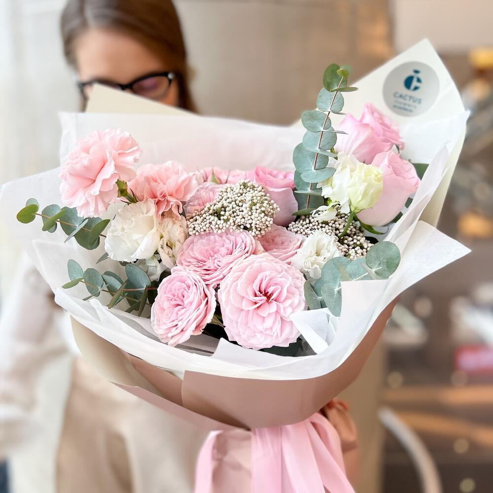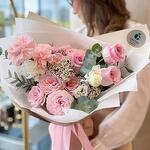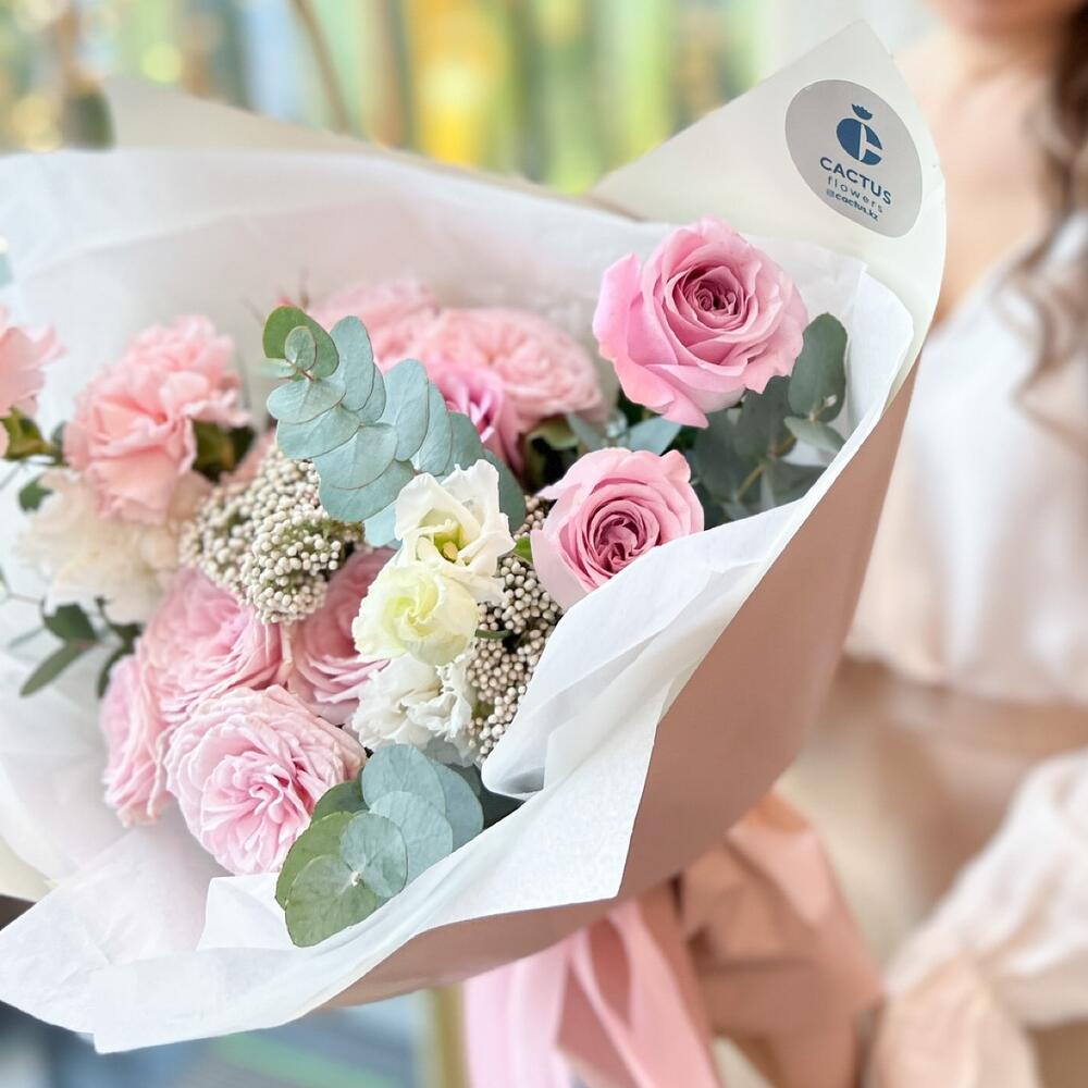 Озотамнус - 2 шт. Эвкалипт - 2 шт. Эустома - 1 шт. Диантус - 3 шт. Пионовидная кустовая роза - 2 шт. Авторская упаковка - 1 шт. розы 40 см - 3 шт.