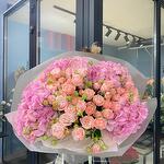Упаковка дизайнерская - 1 шт. Аквабокс - 1 шт. Роза спрей - 10 шт. Гортензия розовая - 4 шт. витамины для цветов - 1 шт. бесплатная открытка на выбор - 1 шт.