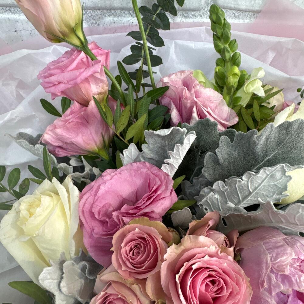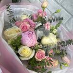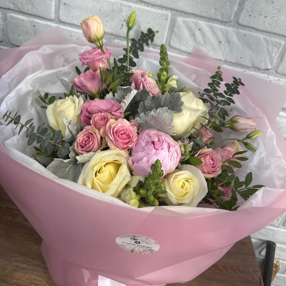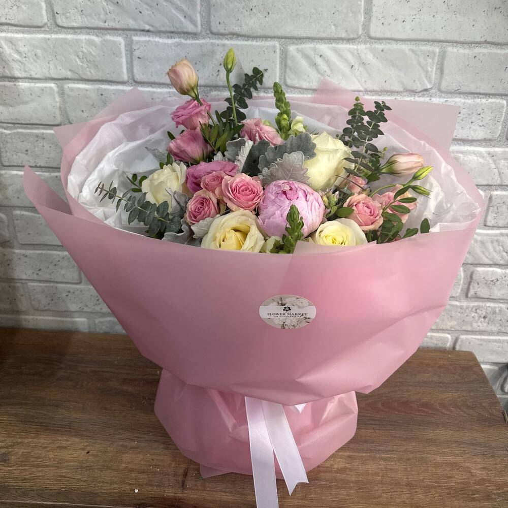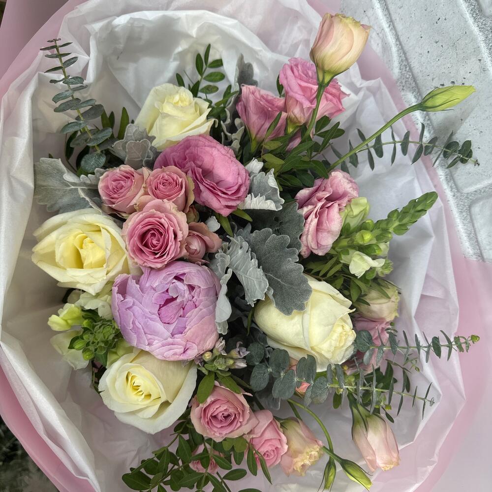 Пион - 1 шт. Писташ - 4 шт. Роза - 5 шт. Кустовая роза - 2 шт. Упаковка - 5 шт. Эустома - 2 шт. Львиный зев - 2 шт. Эвкалипт Baby Blue - 4 шт. Твидия - 3 шт.