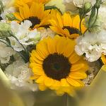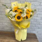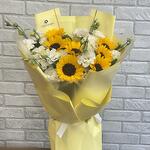 Лента - 1 шт. Эустома - 6 шт. Бумага - 6 шт. Подсолнух - 7 шт.