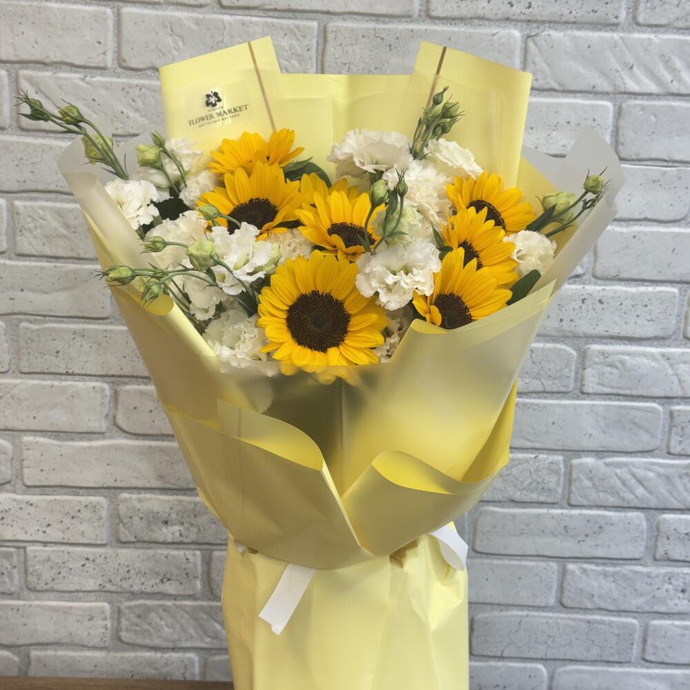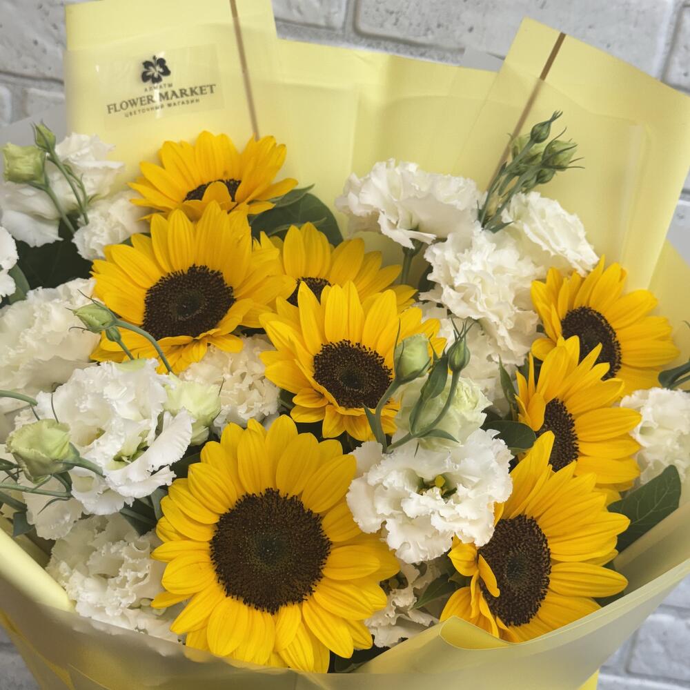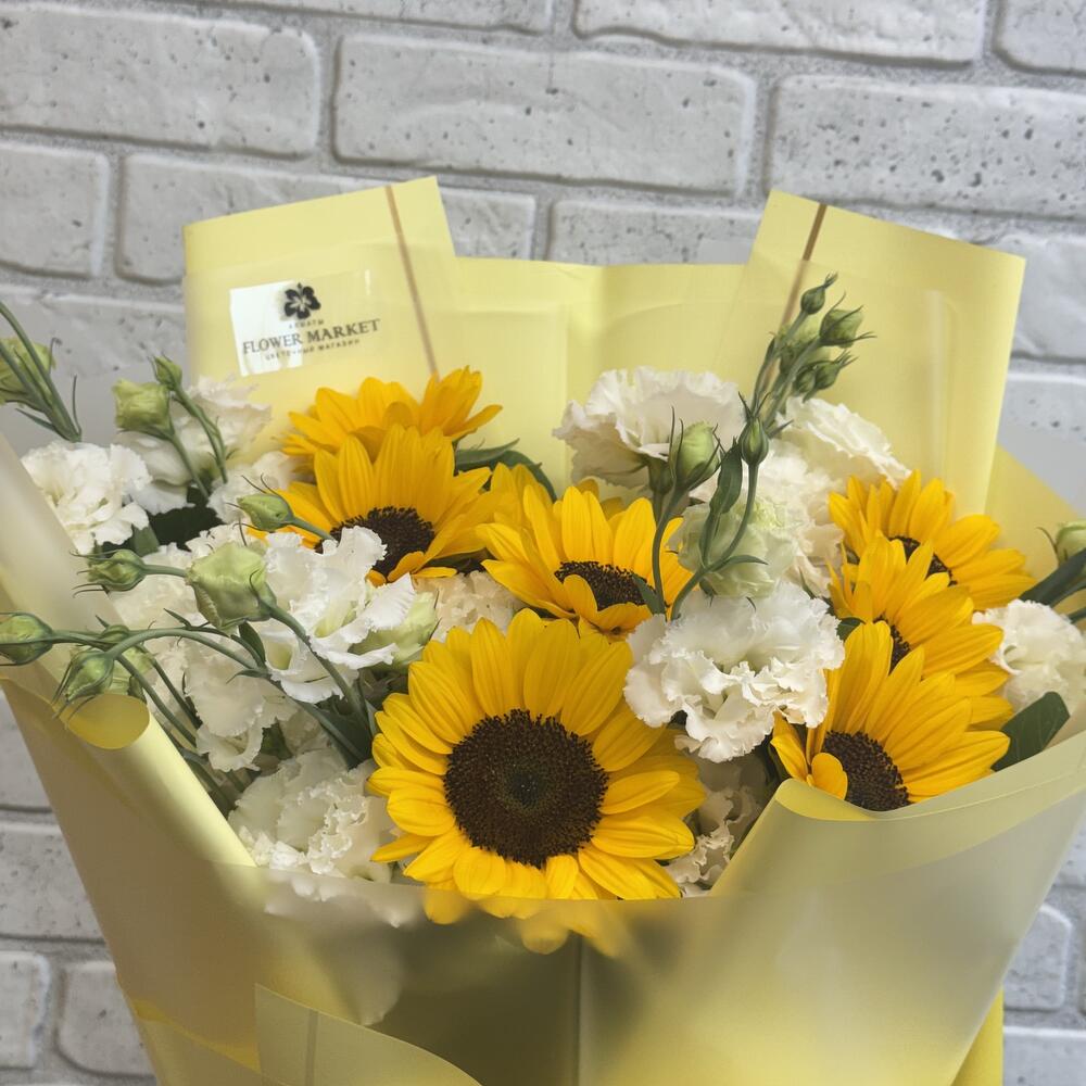Лента - 1 шт. Эустома - 6 шт. Бумага - 6 шт. Подсолнух - 7 шт.