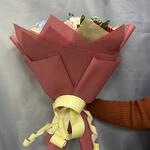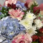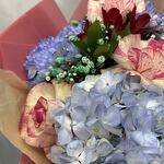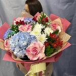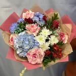 Альстромерия - 3 шт. Рускус - 2 шт. Роза Эквадор - 5 шт. Хризантема кустовая Белая - 1 шт. Упаковка дизайнерская - 1 шт. Хризантема кустовая сиреневая - 2 шт. гипсофила радужная - 1 шт. гортензия голубая большая - 1 шт.